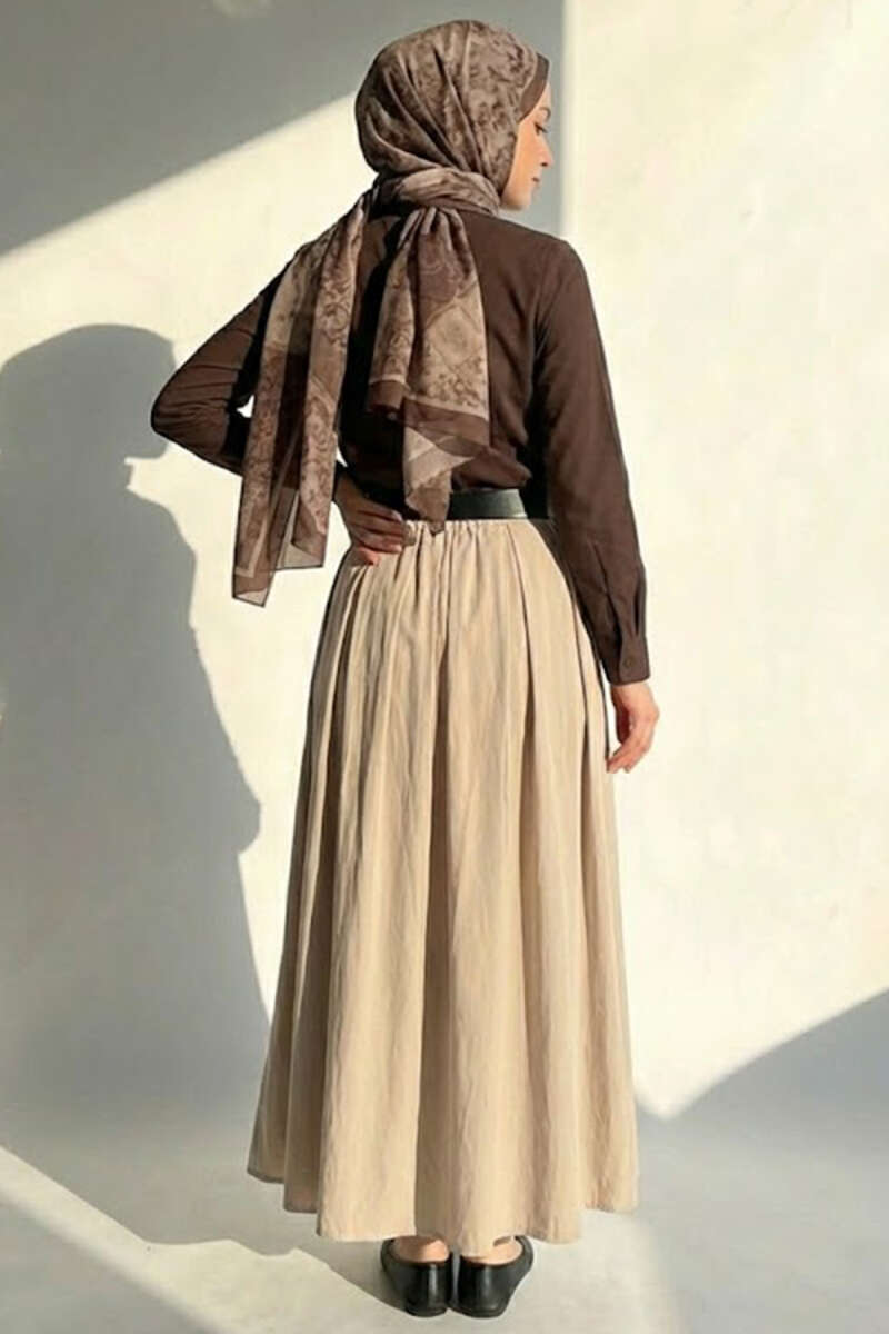 Kemerli Tensel Pileli Etek Kahve