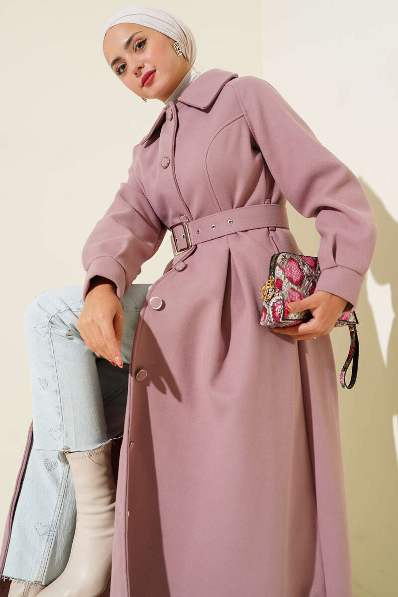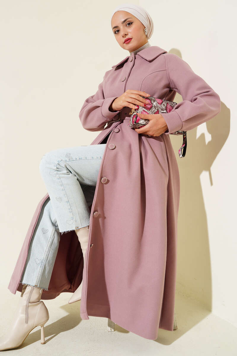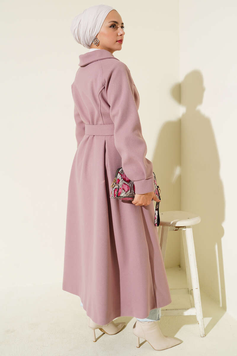 Düğmeli Kuşak Detaylı Kaşe Kaban Latte