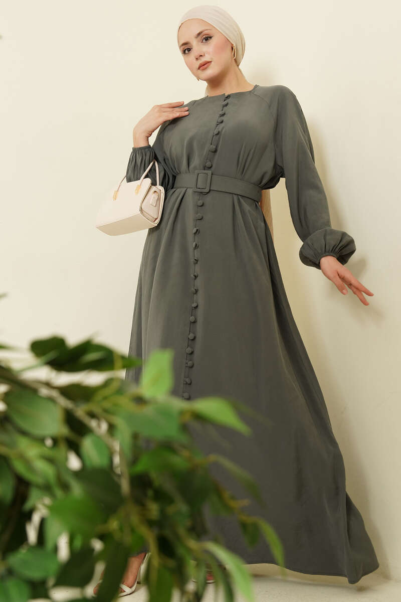 Kemerli Yarım Brit Düğmeli Modal Elbise Nefti