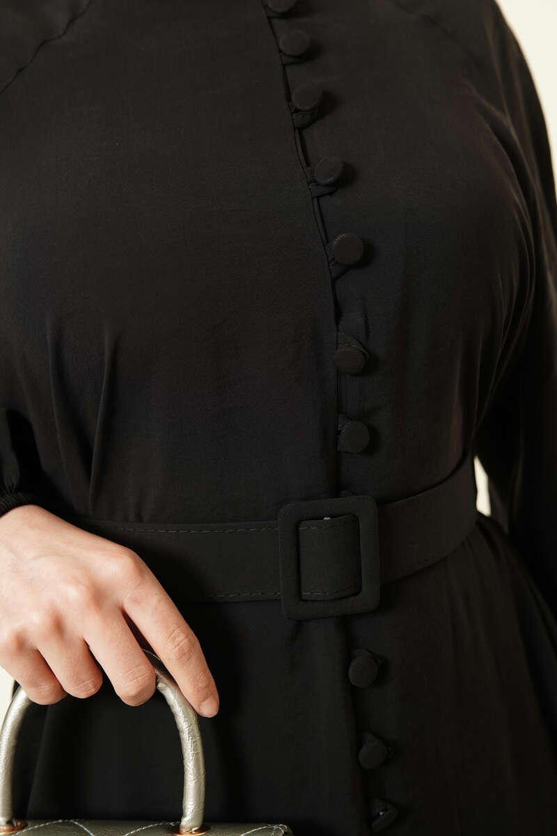 Kemerli Yarım Brit Düğmeli Modal Elbise Siyah