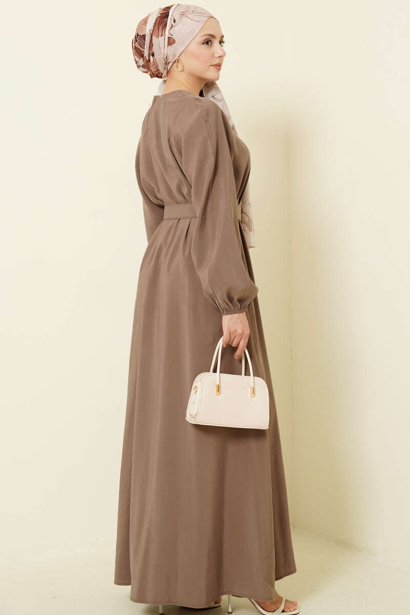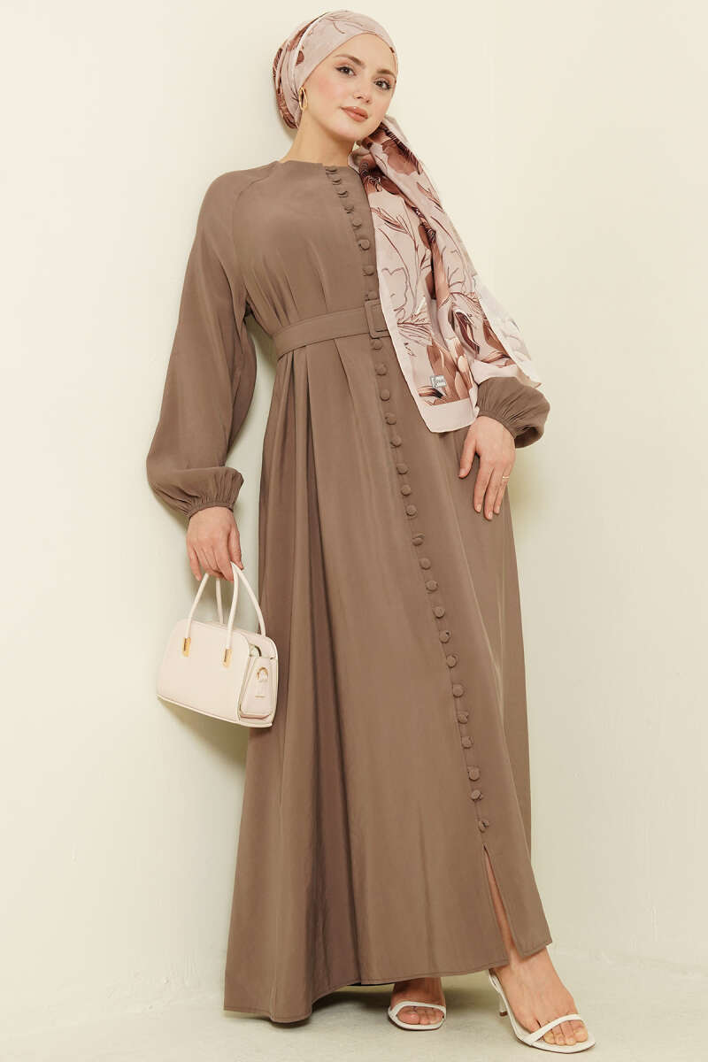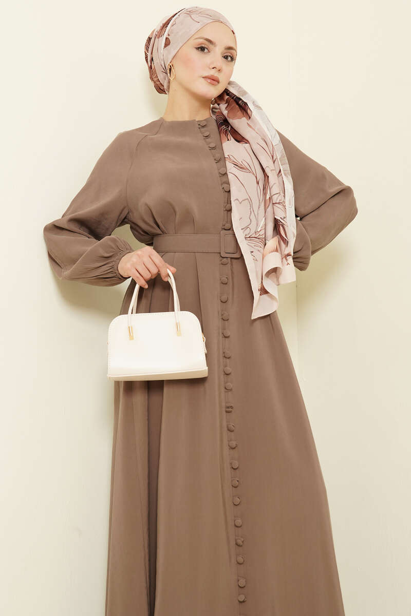 Kemerli Yarım Brit Düğmeli Modal Elbise Sütlü Kahve
