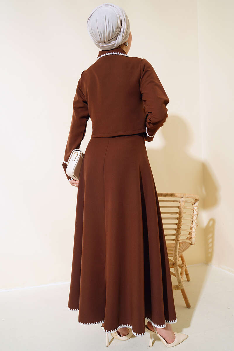 Yeni sezon ikili takım modelimiz sizlerle beraber. Ceketimizin yakası ve kol bilekleri dikiş detaylıdır. iki adet cep kapağı vardır. Ceketimizin önü düğmelidir. Eteğimiz kloş modeldir. Etek uçları dikiş detaylıdır. Astarsızdır. Eteğimizin beli fermuarlıdır. Sade ve zarif olan ikili takımımız vazgeçilmez parçanız olacak.