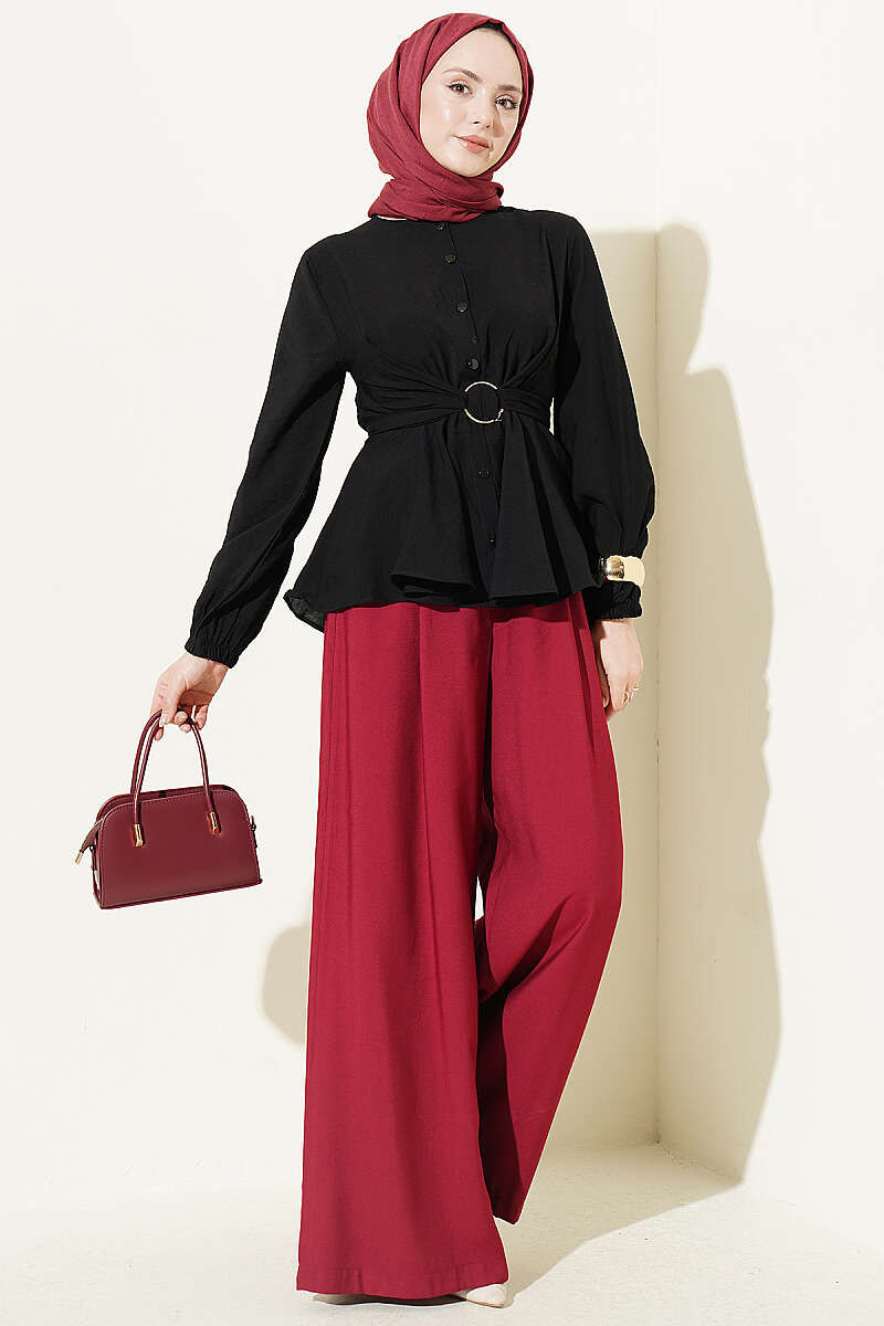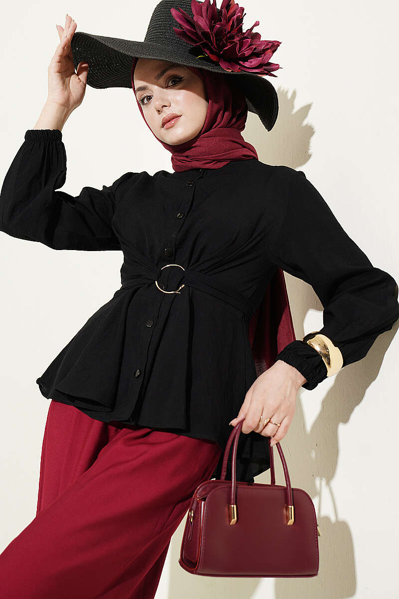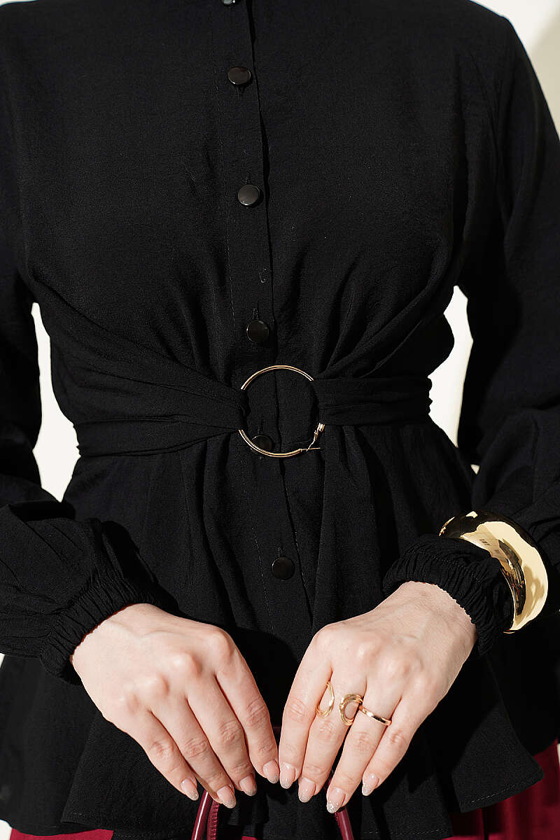 Kendinden Bağlamalı Kısa Gömlek Siyah