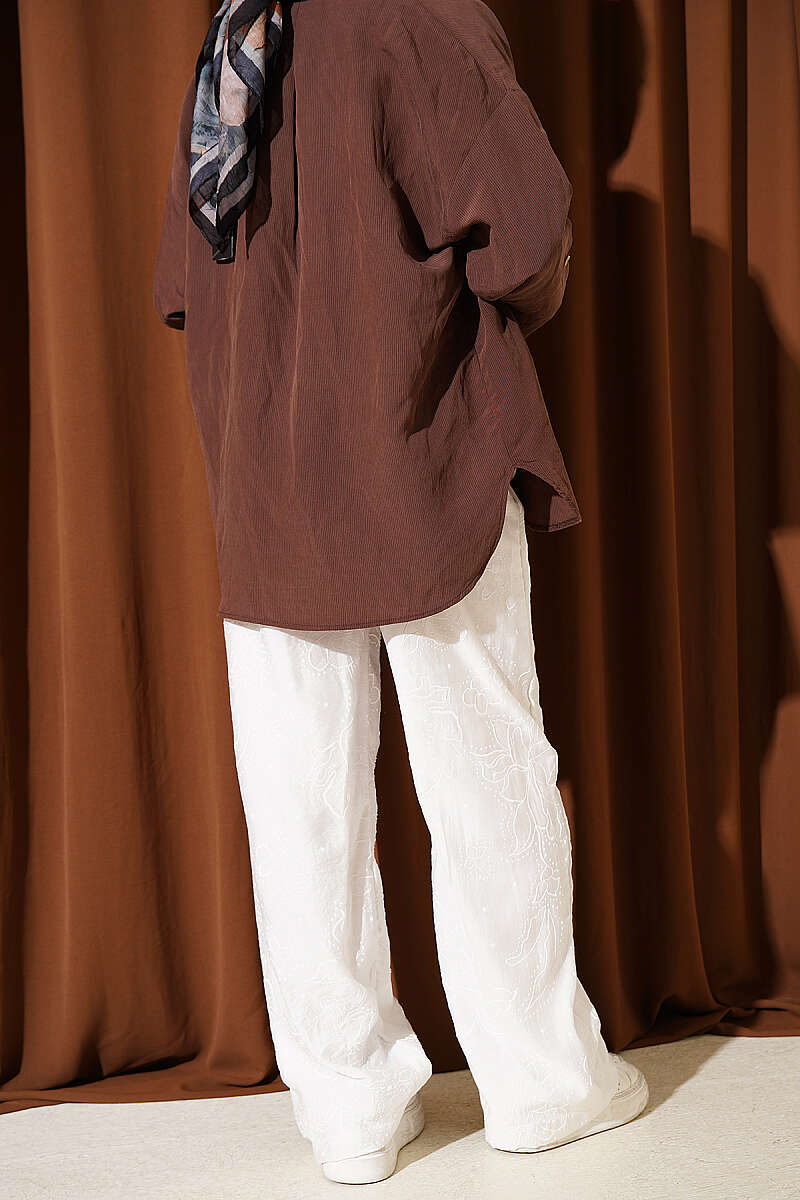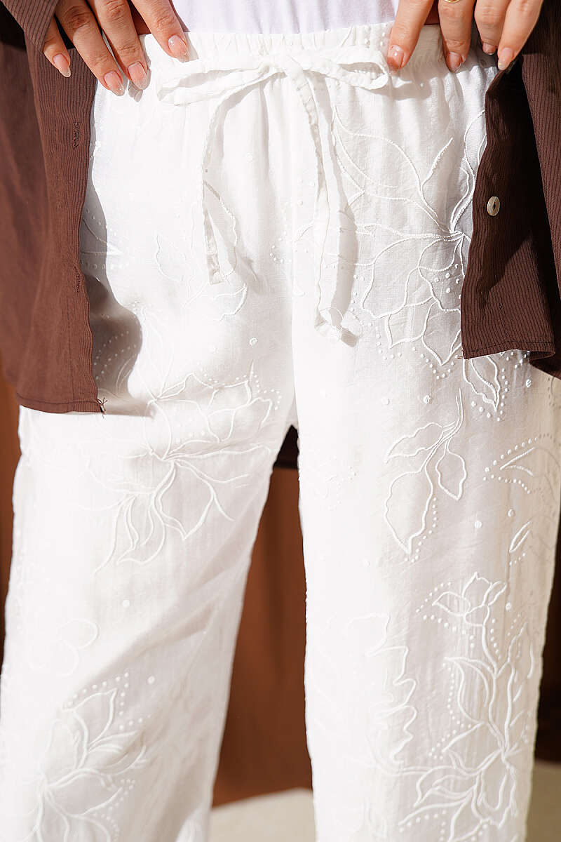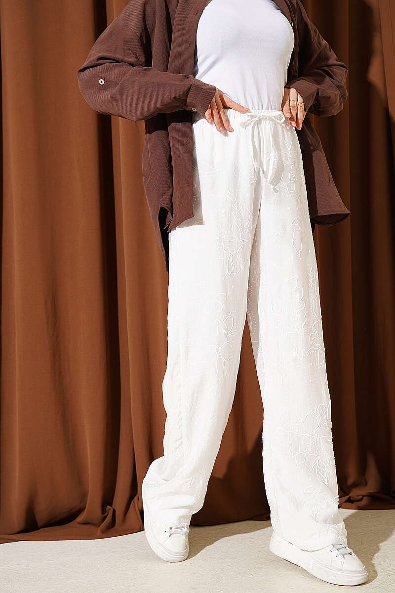 Kendinden Desenli Bel Lastikli Pantolon Beyaz