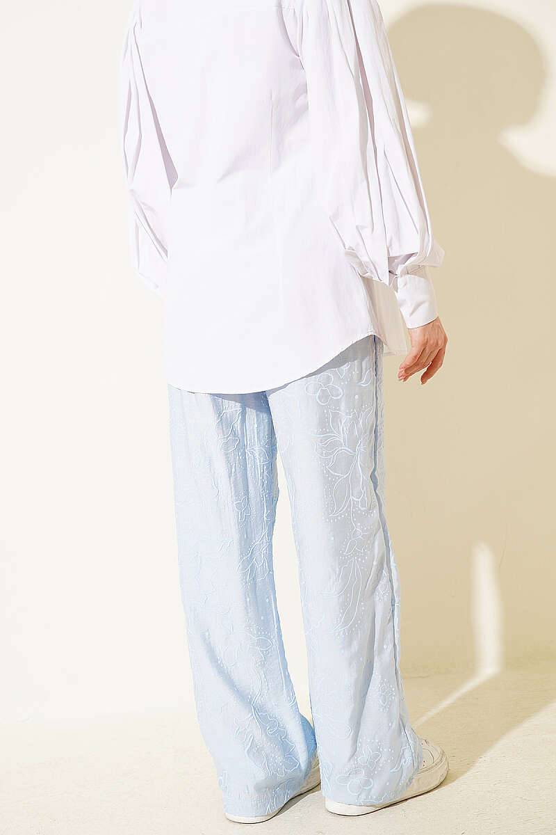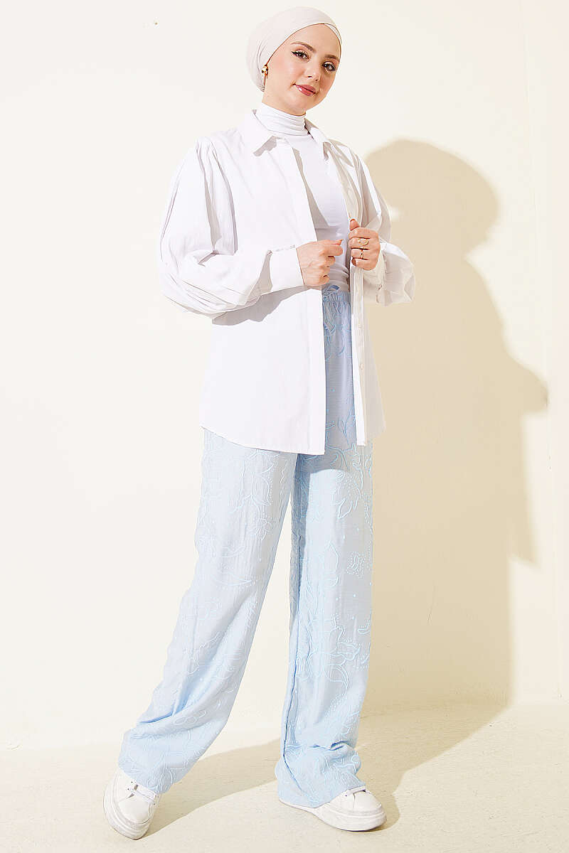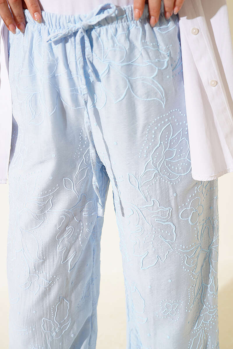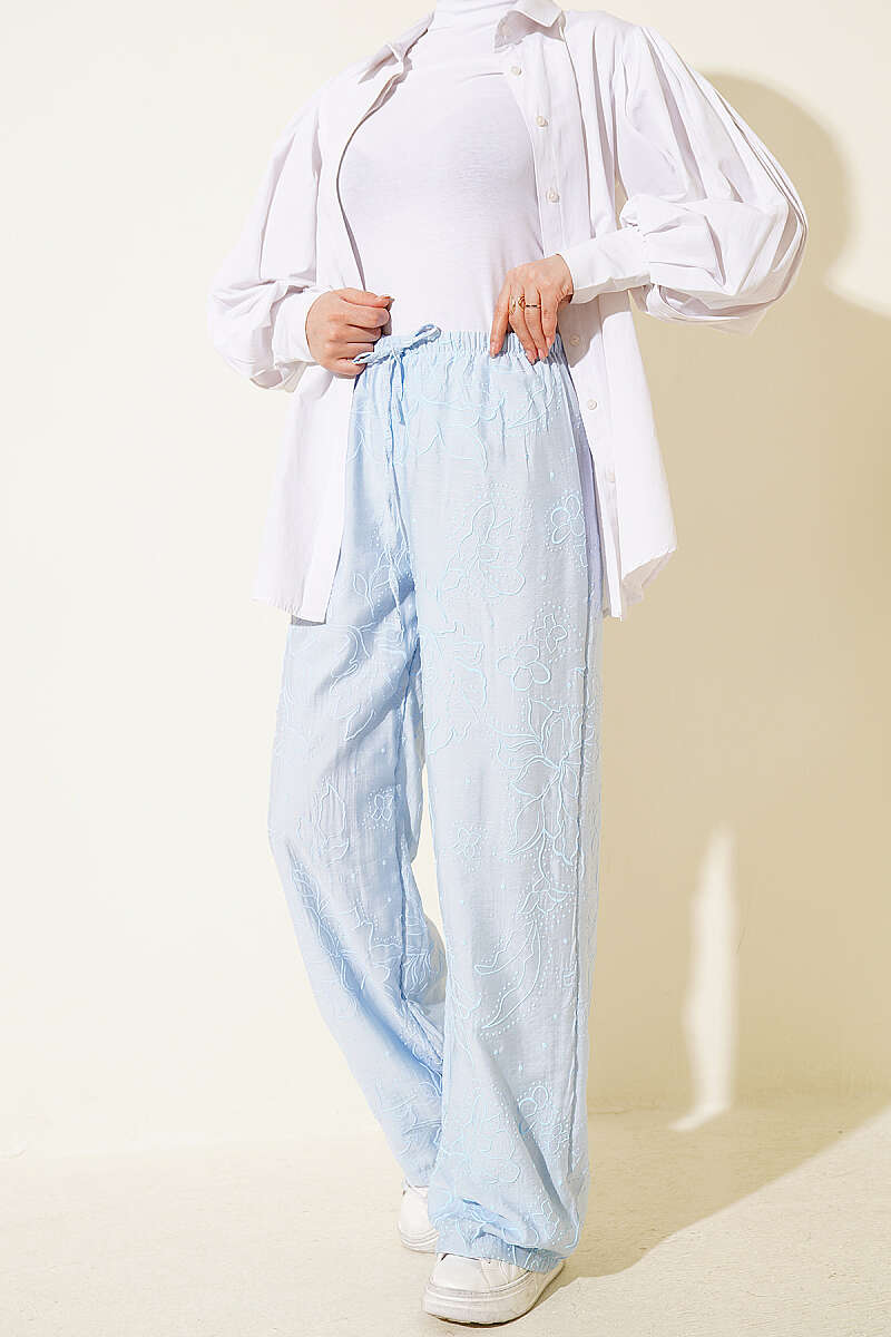 Kendinden Desenli Bel Lastikli Pantolon Buz Mavisi