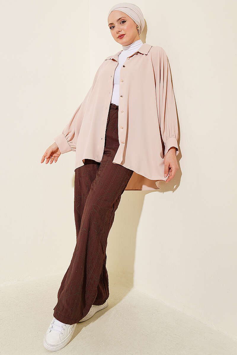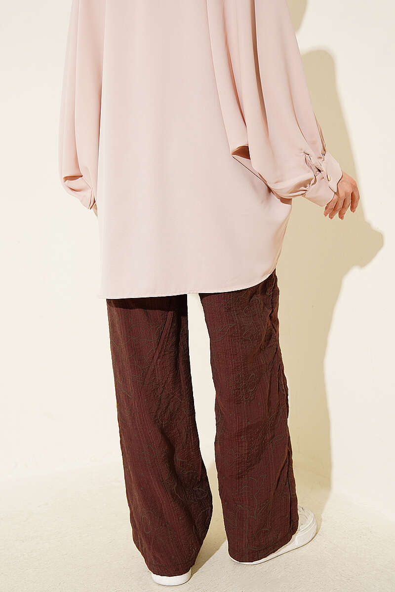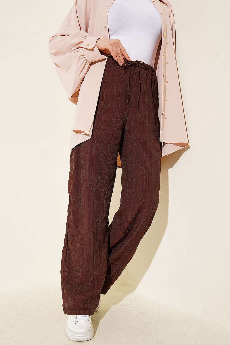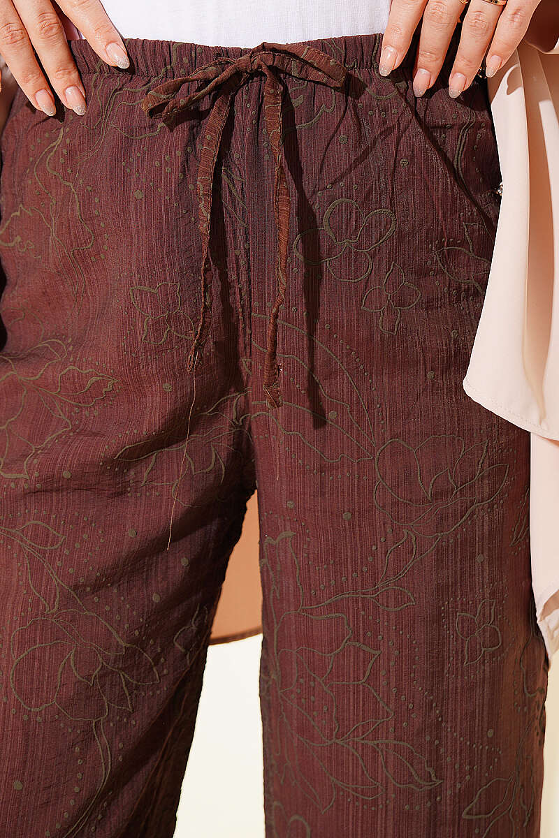 Kendinden Desenli Bel Lastikli Pantolon Kahve