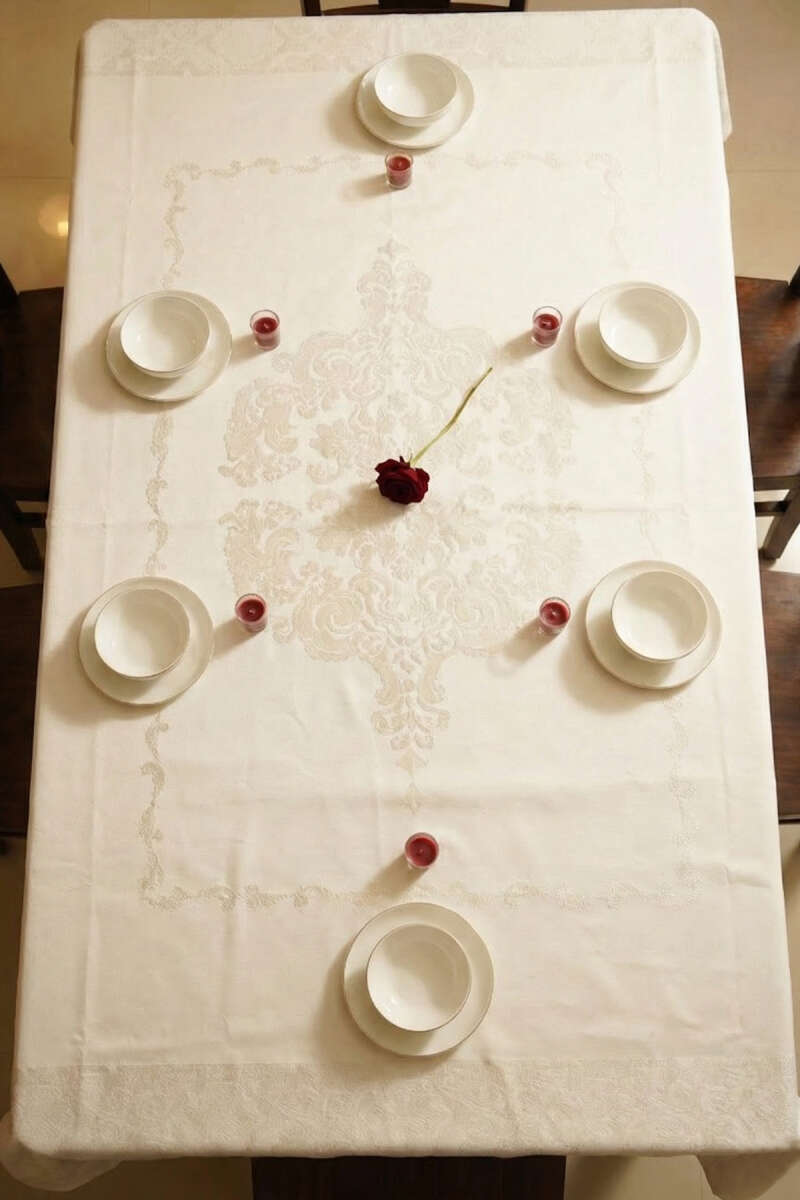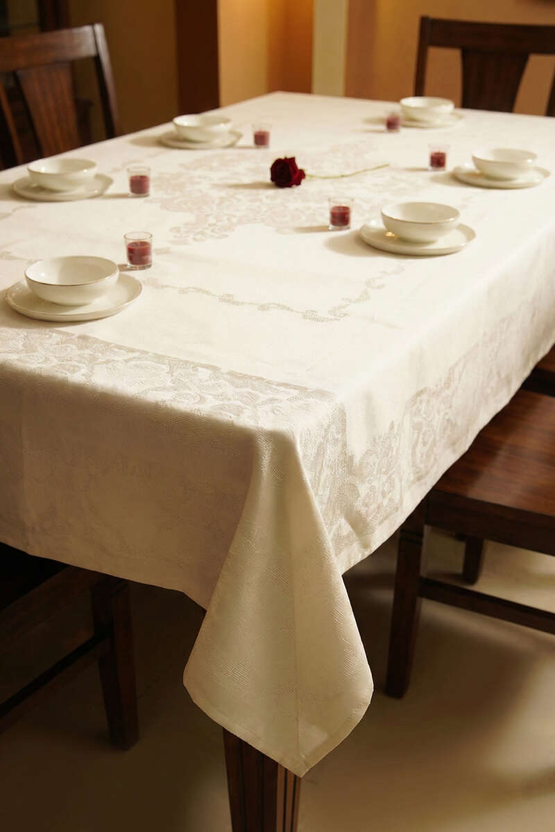 Özel davetlerinizden günlük aile yemeklerinize kadar her anınıza asalet katacak bu  jakarlı masa örtüsü, şıklığı ve kaliteyi bir araya getiriyor. Kendinden desenli ağır dokusu ve zarif dökümüyle masanızı bir tabloya dönüştürür.