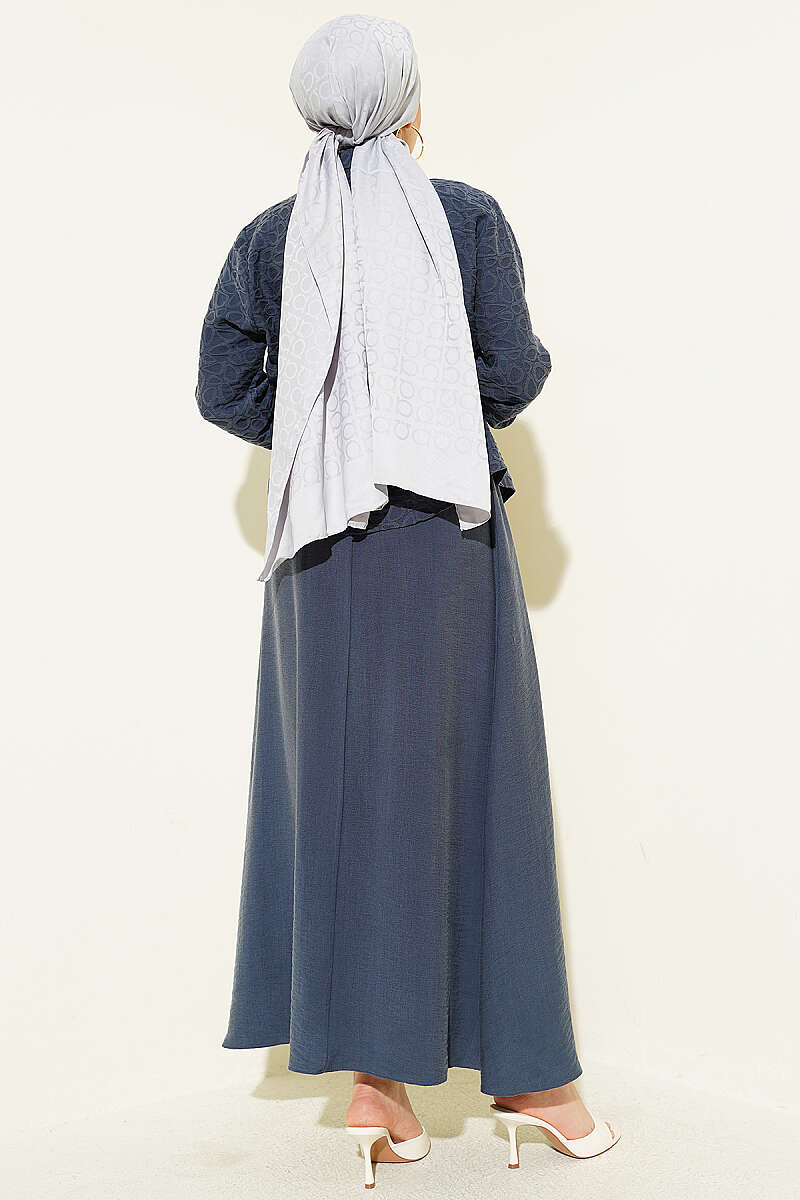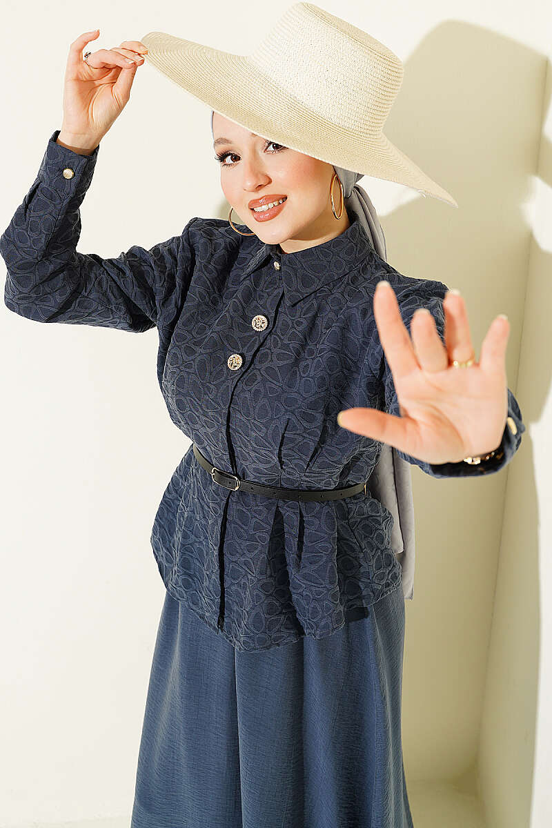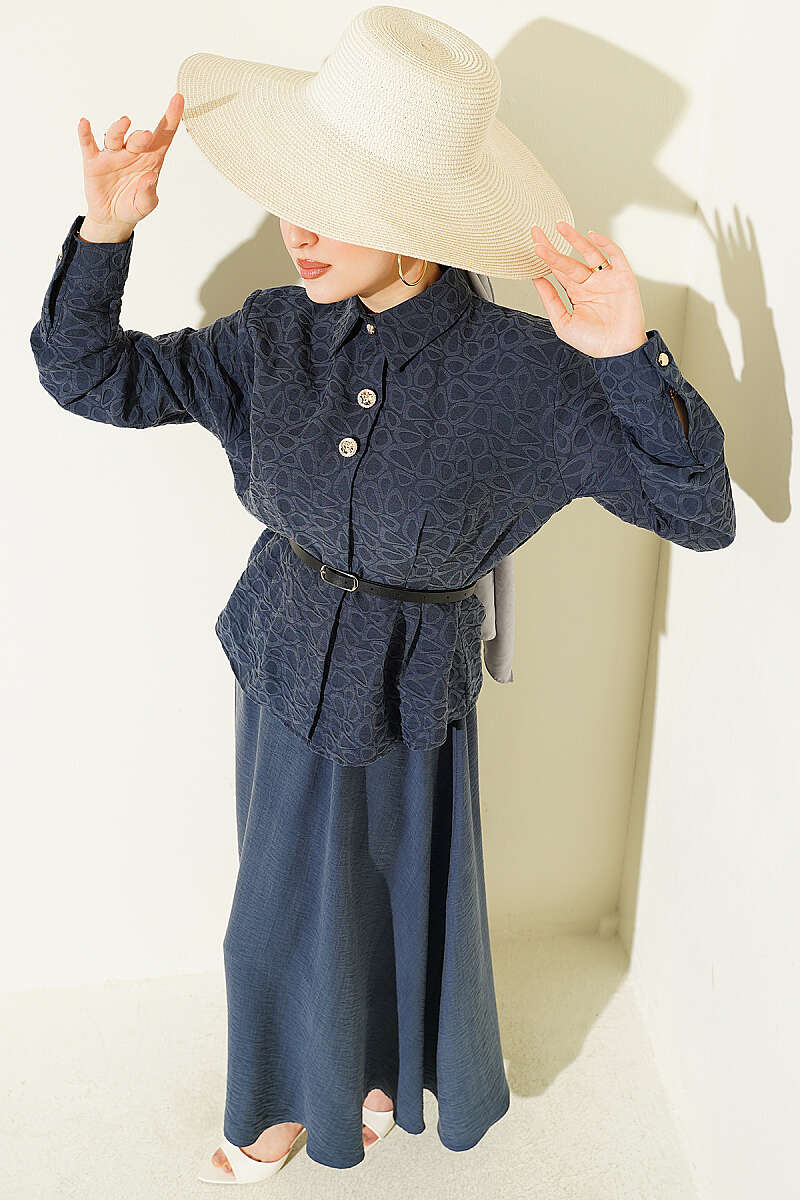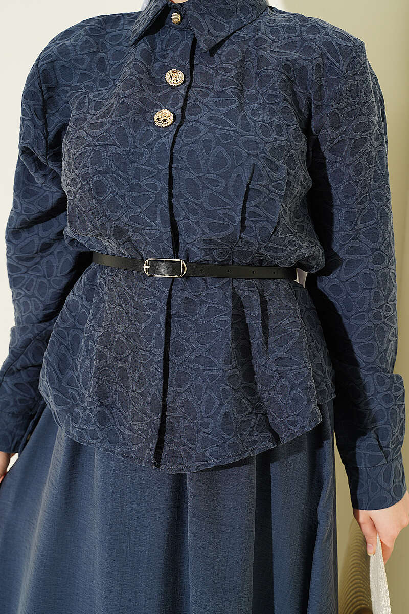 Kendinden Desenli Kemerli Tensel Etekli Takım Lacivert