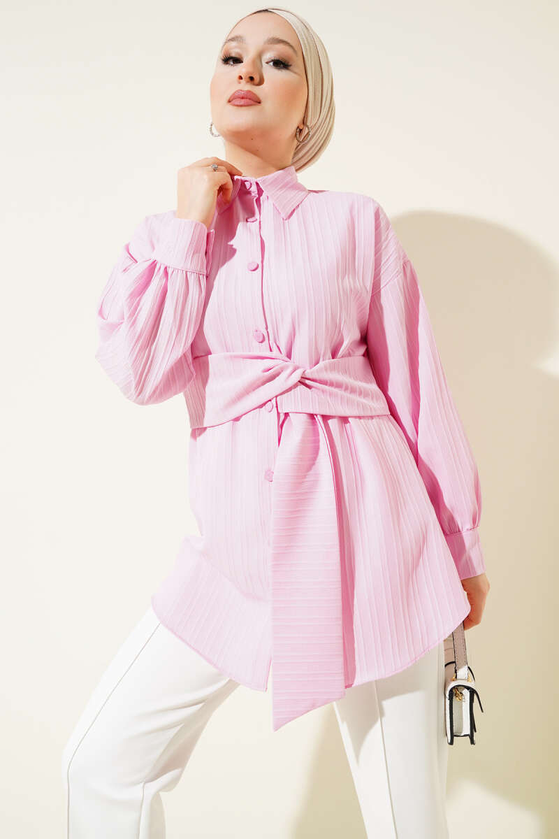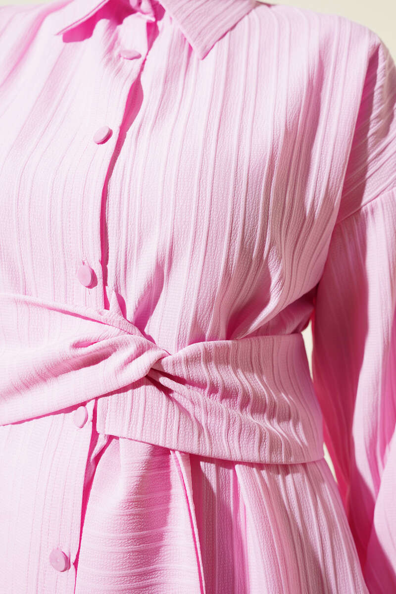 Gizli Düğmeli Bel Kuşaklı Gömlek Pembe
