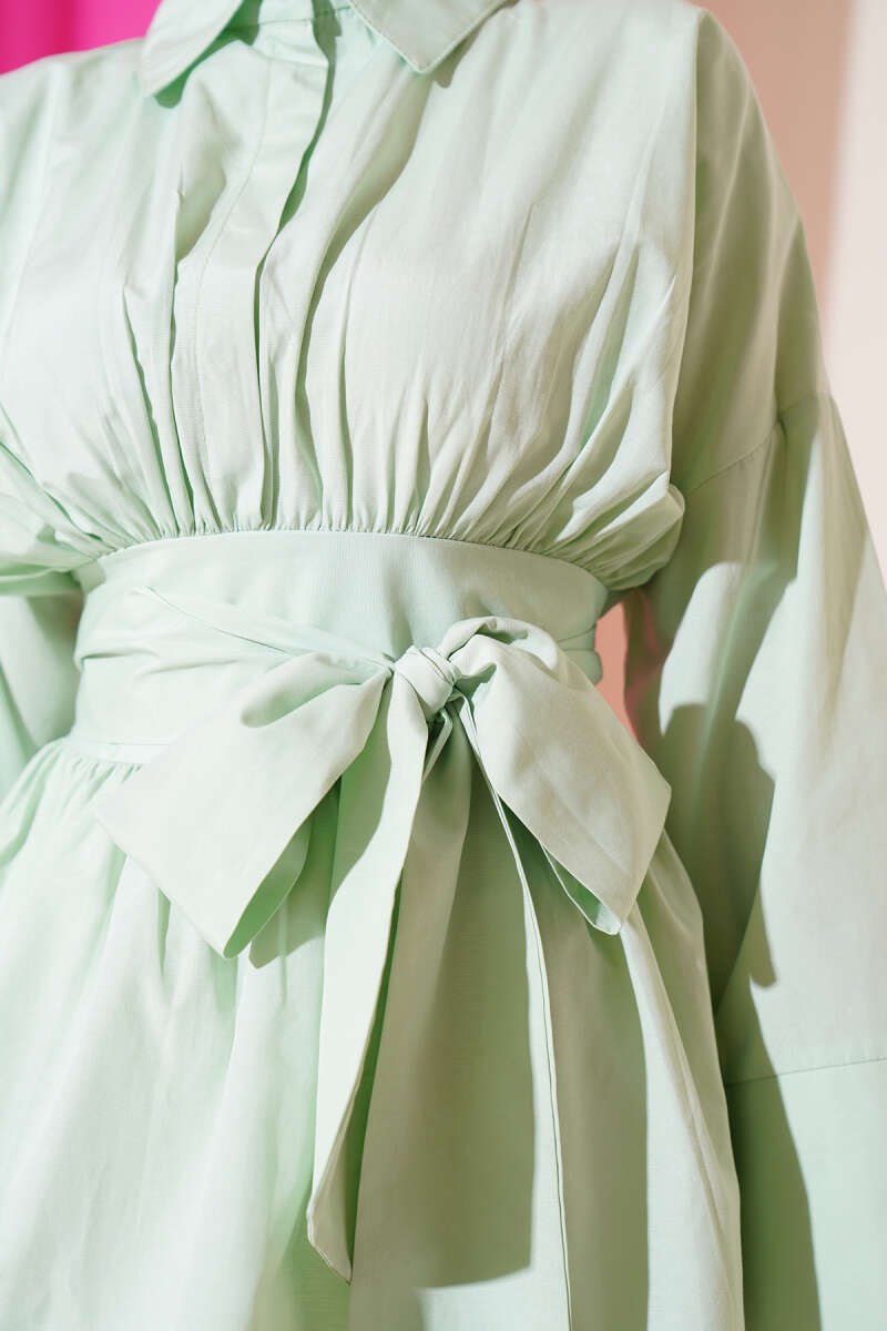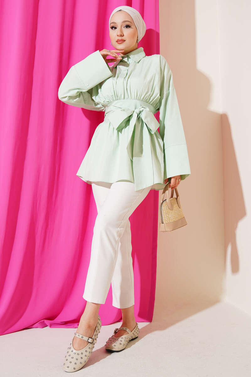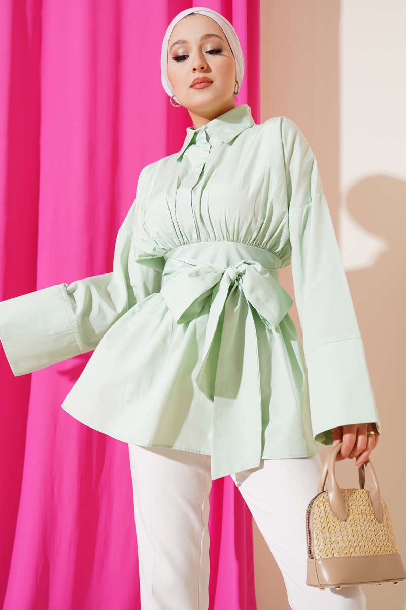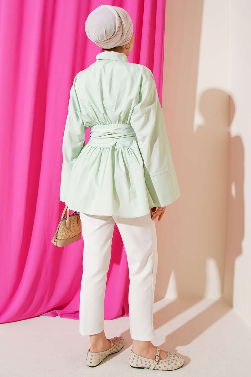 Kendinden Kuşaklı Önü Büzgülü Tunik Su Yeşili