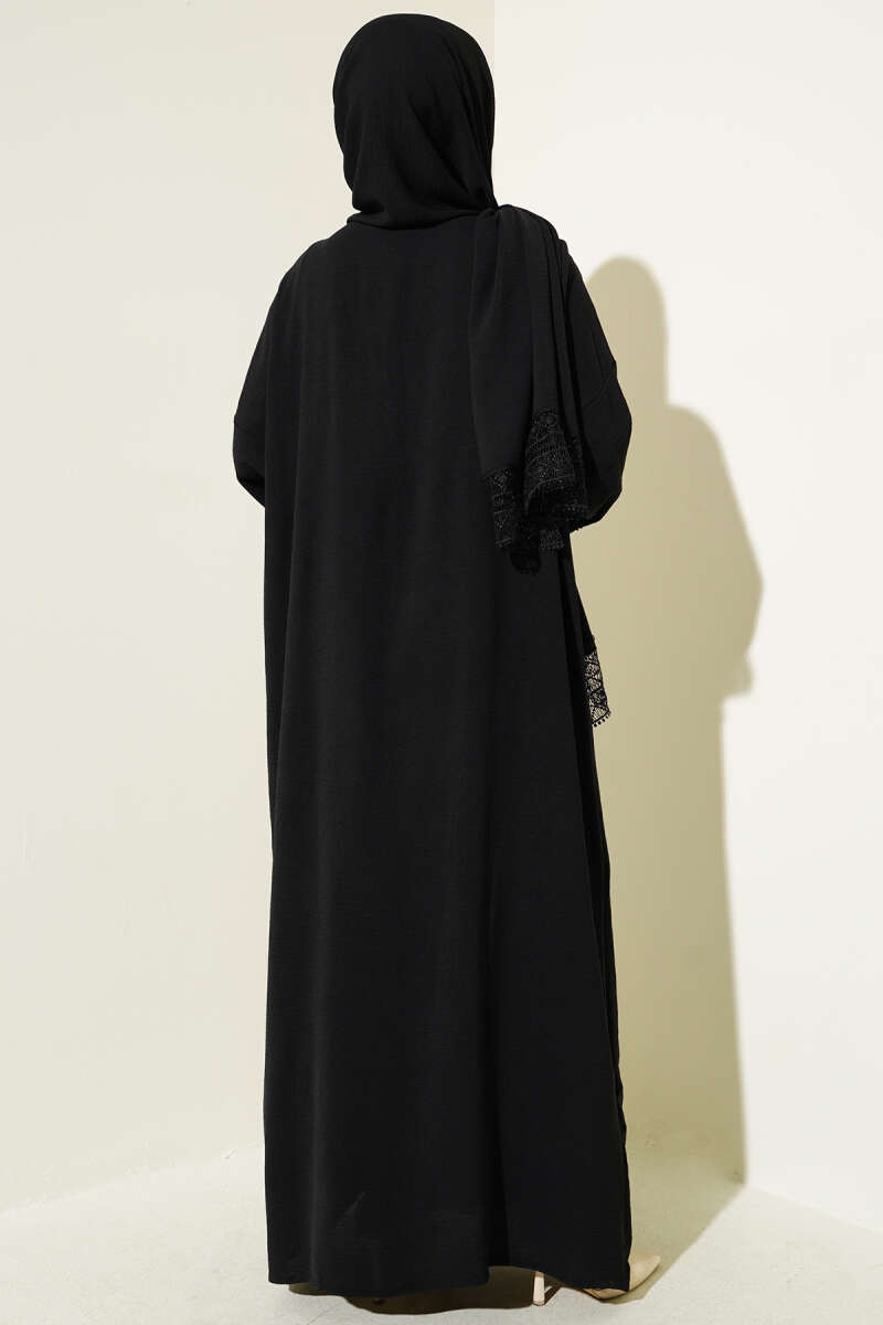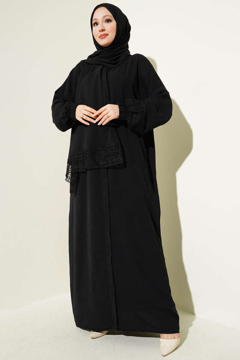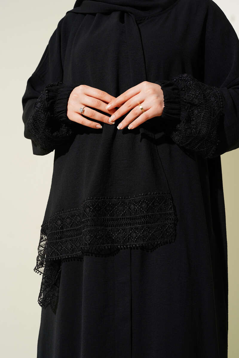 Kendinden Şallı Dantelli Namaz Elbisesi Siyah