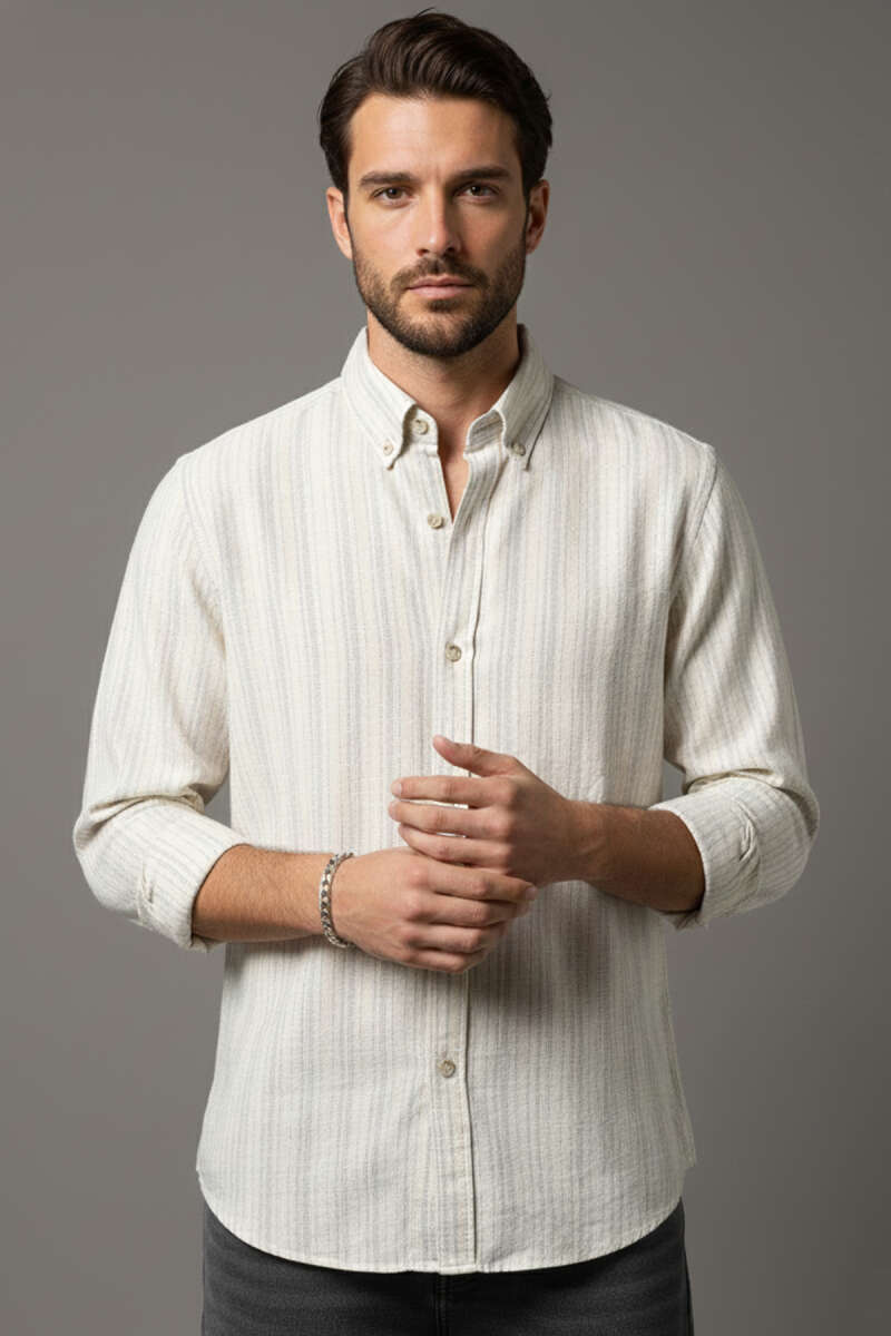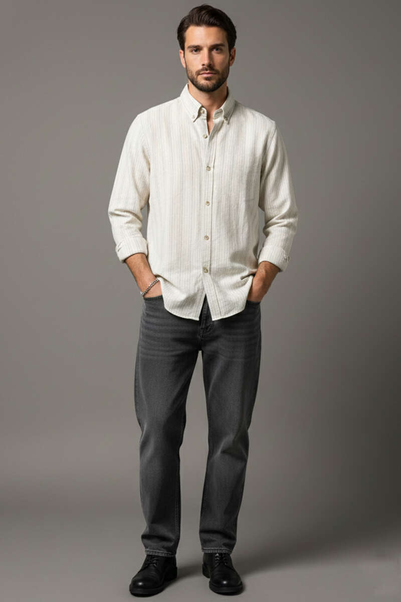 Geniş Çizgili Erkek Keten Gömlek Latte