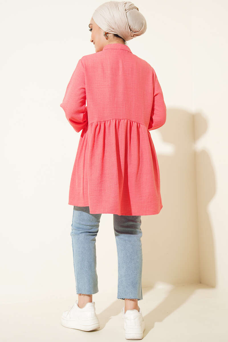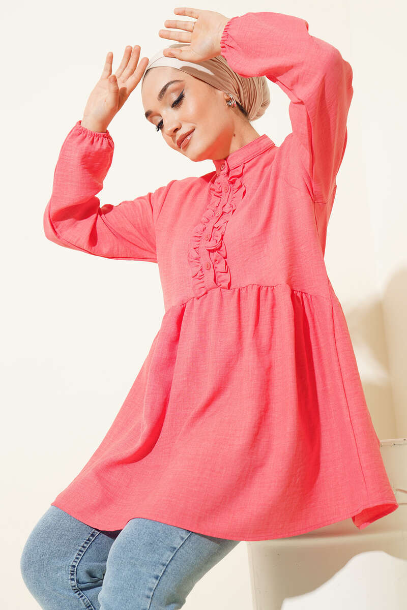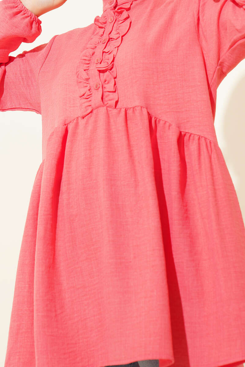 Keten Çift Fırfırlı Hakim Yaka Tunik Nar Çiçeği