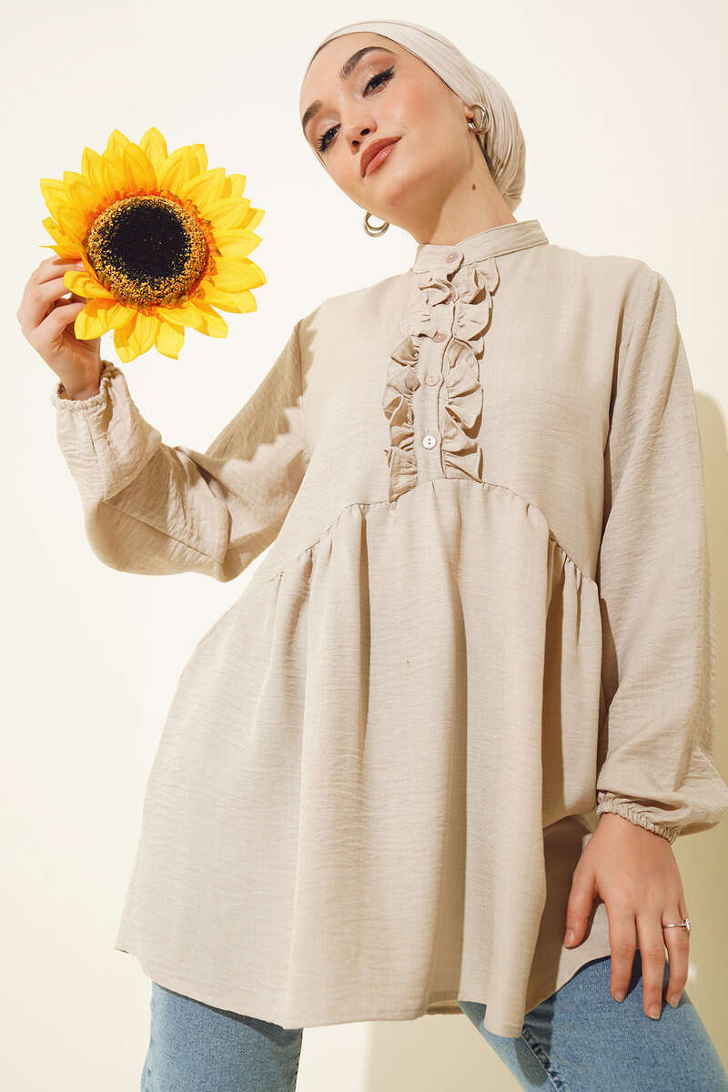 Keten Çift Fırfırlı Hakim Yaka Tunik Taş