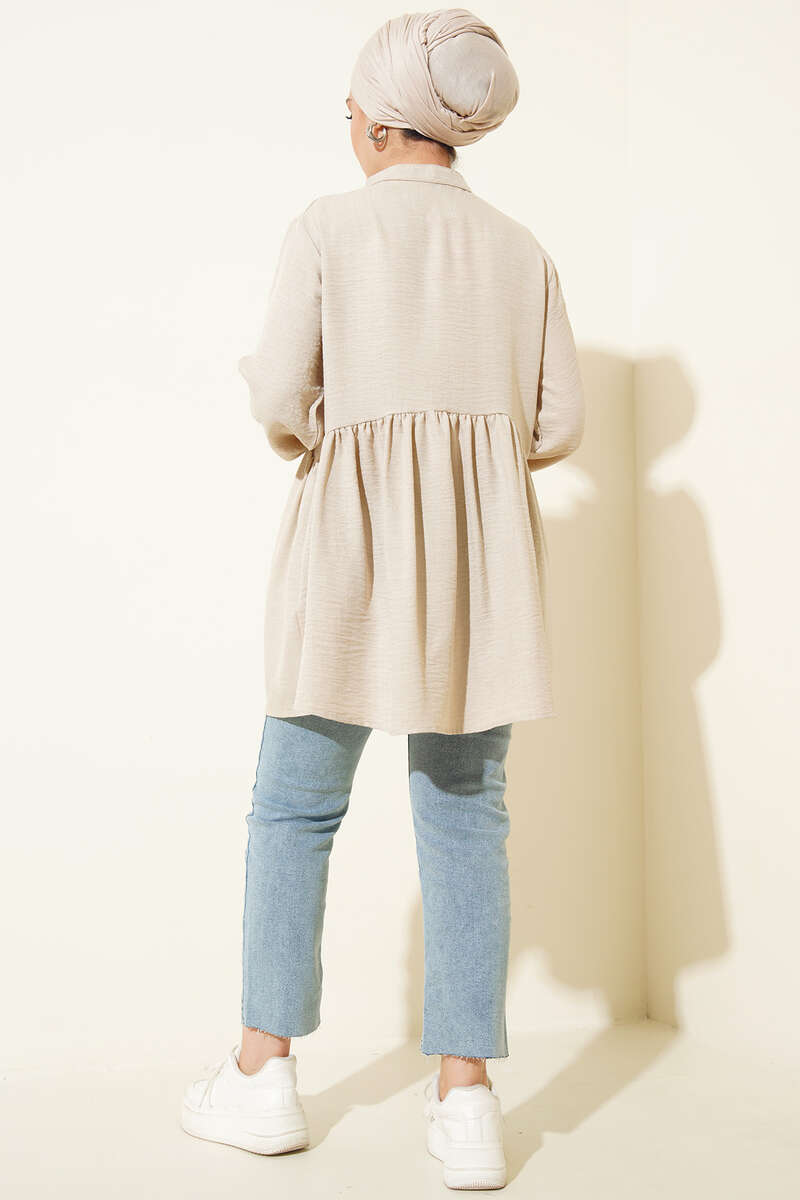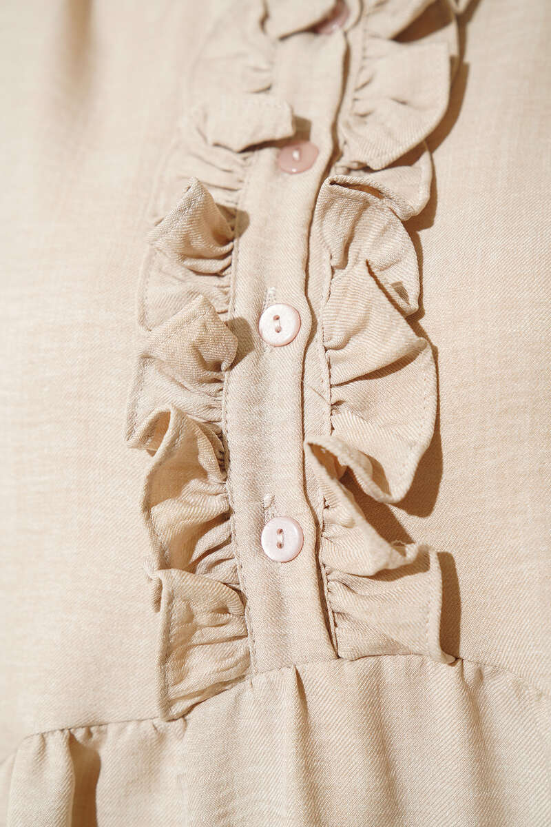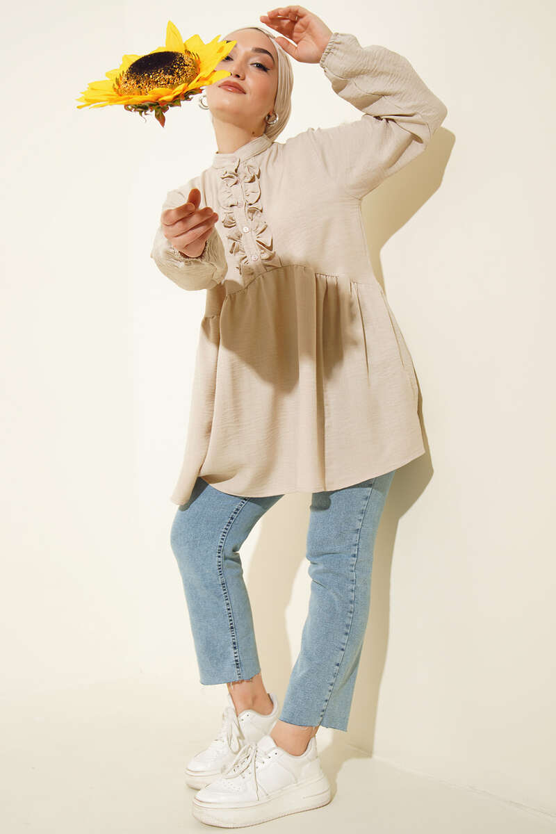 Yeni sezon tuniğimiz fırfırlı yapısıyla dikkat çekmektedir. Elbisemiz hakim yakadır. Bilekleri lastikli olan tuniğimizin ön kısmında düğmeler bulunmaktadır. Renk seçenekleri mevcuttur.