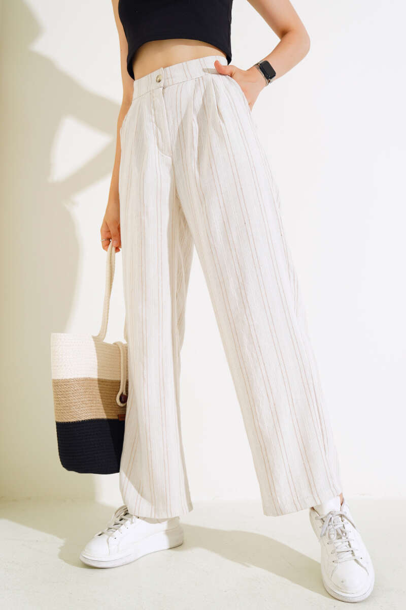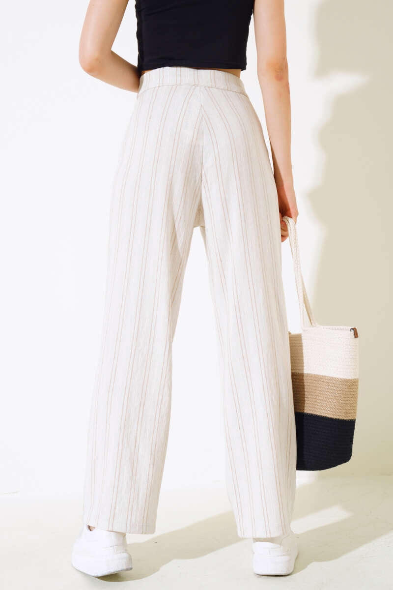 Keten Çizgili Bol Pantolon Latte