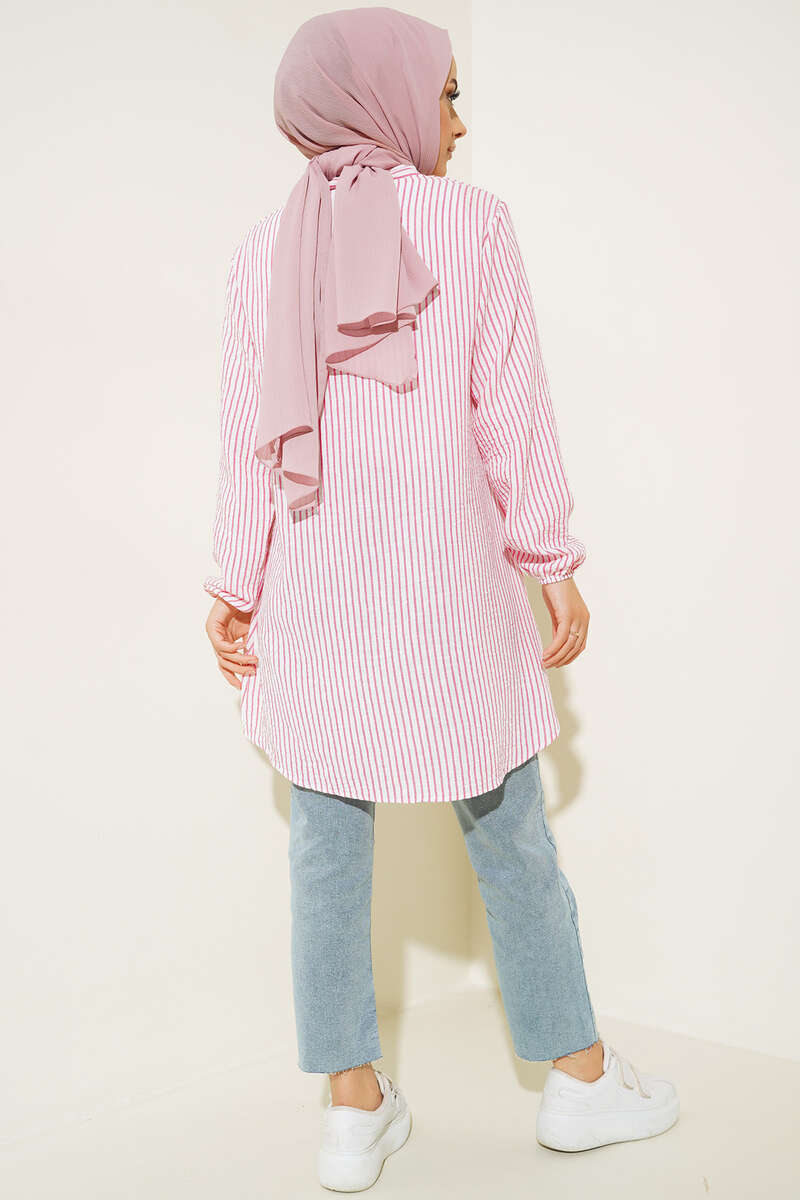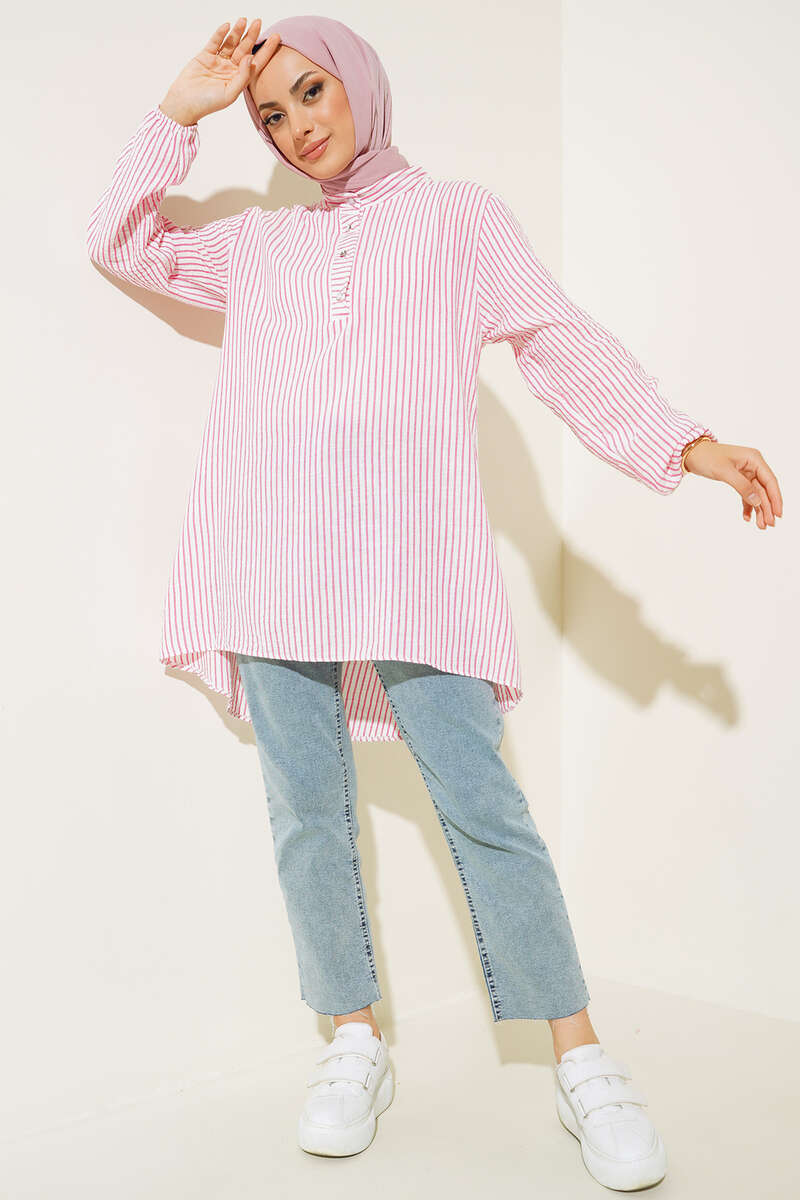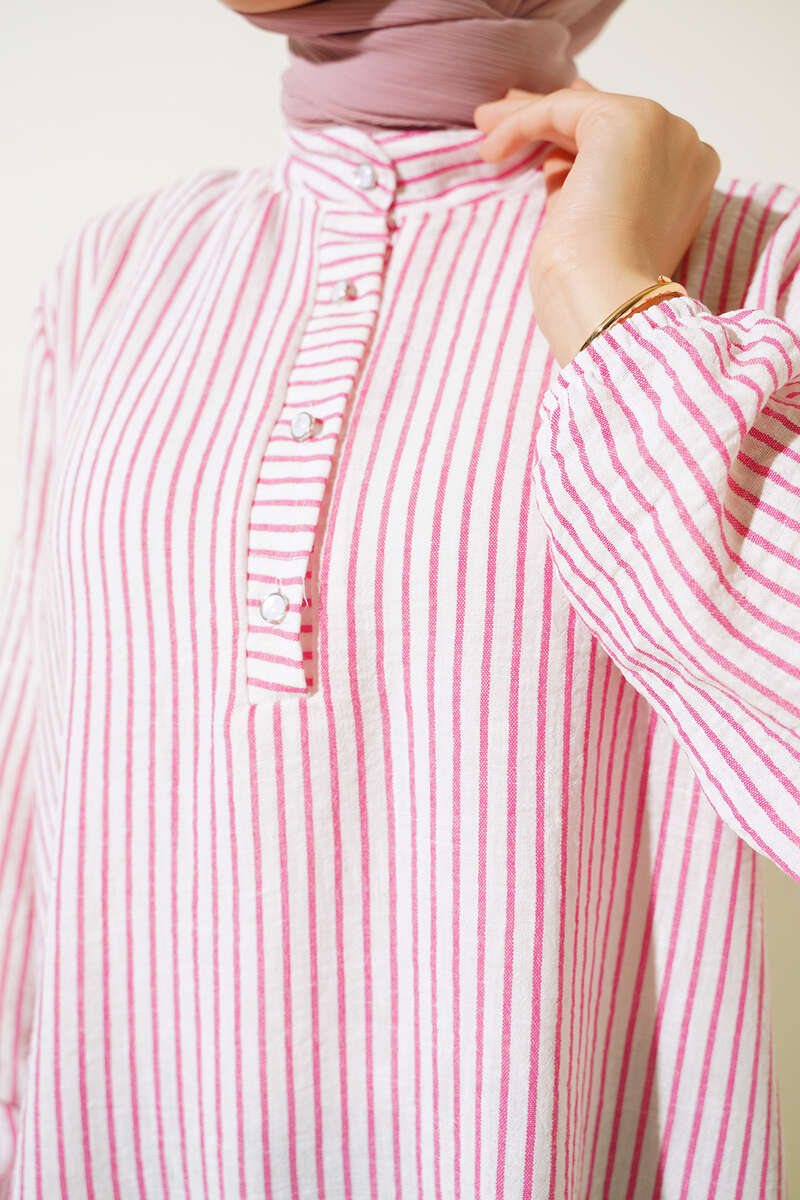 Keten Çizgili Hakim Yaka Düğmeli Tunik Fusya