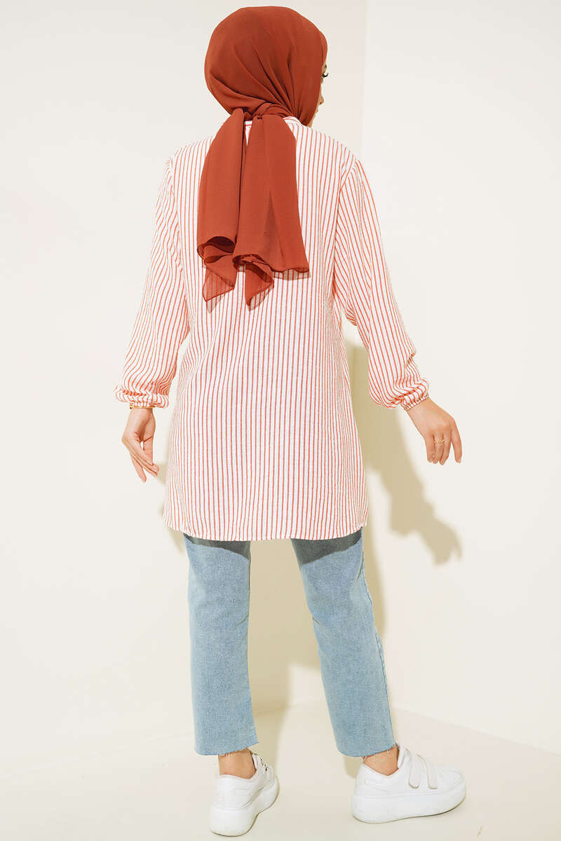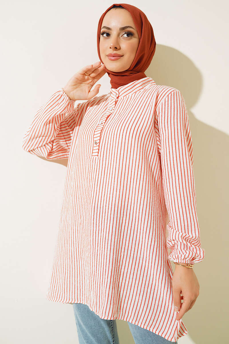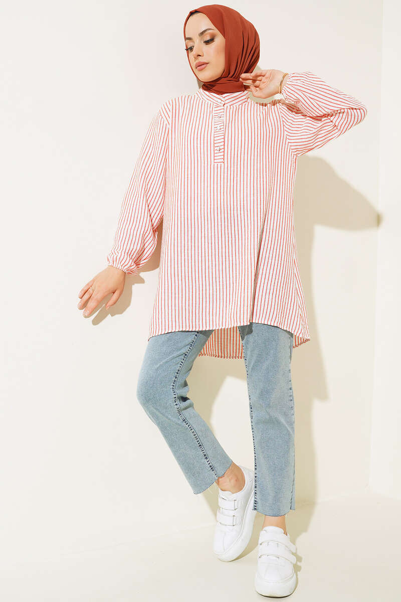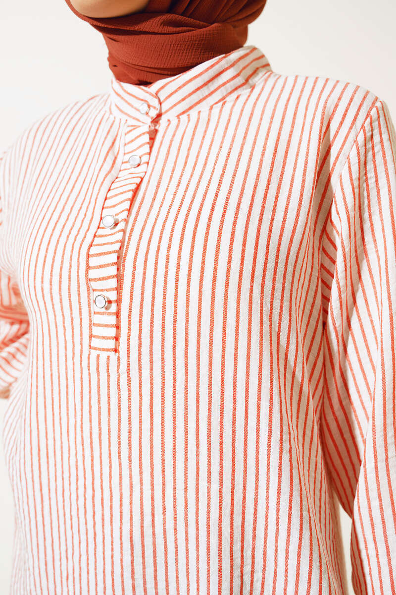 Yeni sezon tuniğimiz çizgili yapısıyla dikkat çekmektedir. Elbisemiz hakim yakadır. Bilekleri lastikli olan tuniğimizin ön kısmında düğmeler bulunmaktadır. Renk seçenekleri mevcuttur.