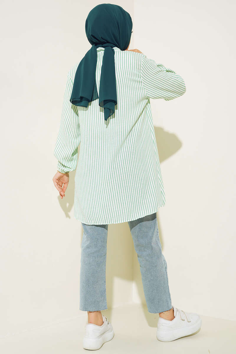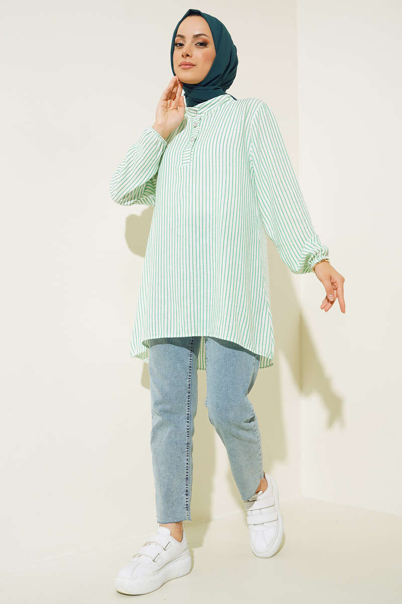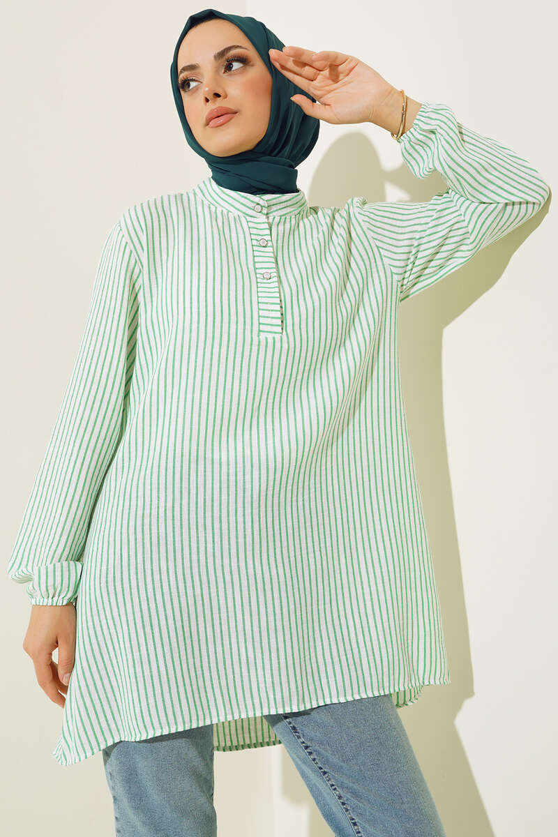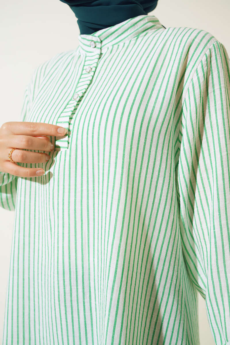 Keten Çizgili Hakim Yaka Düğmeli Tunik Yeşil