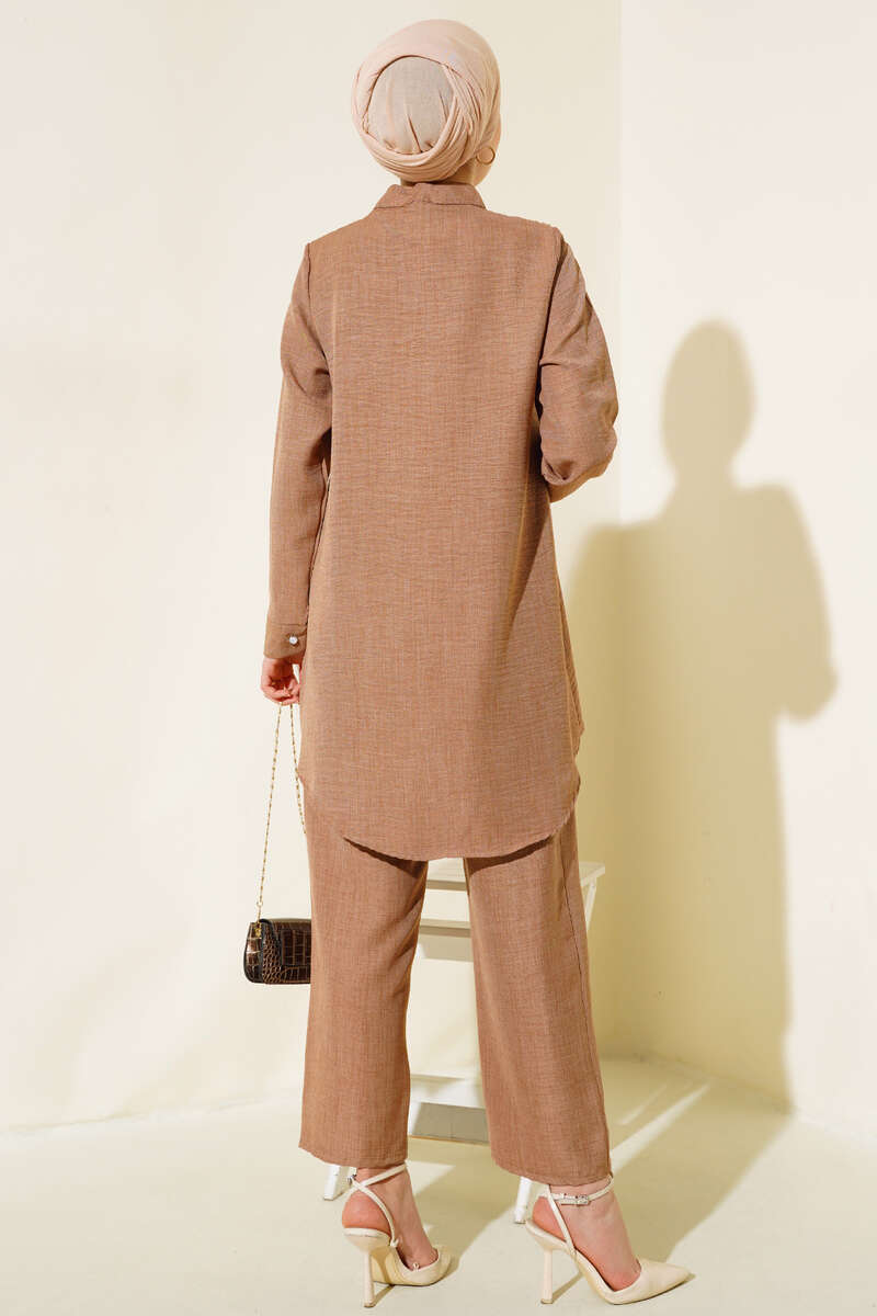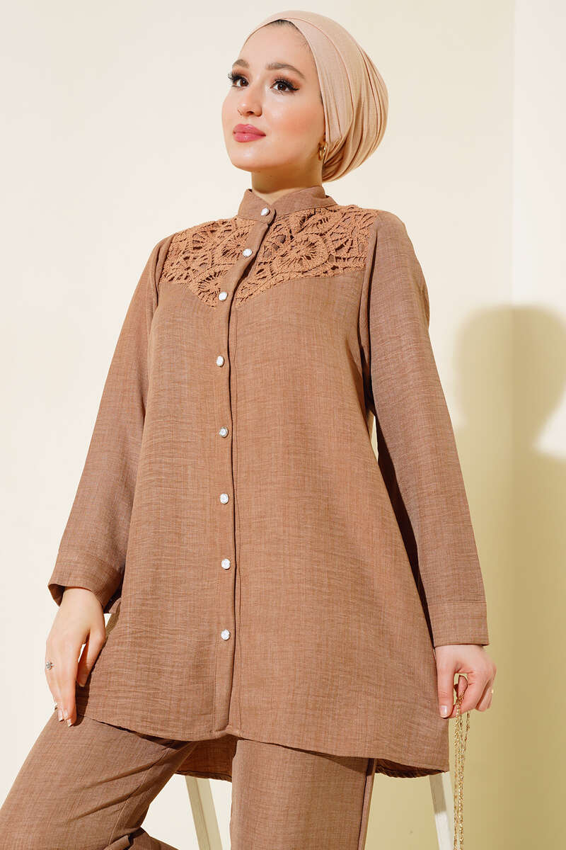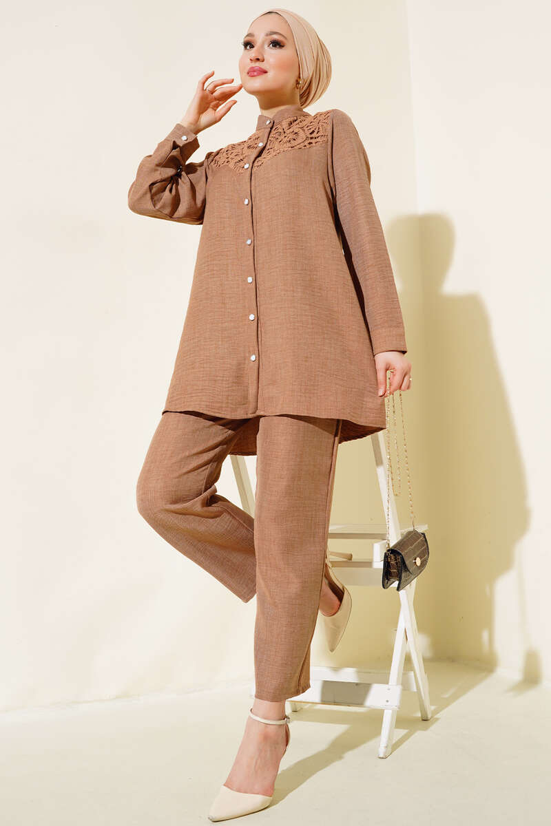Yeni sezon ikili takım modelimiz sizlerledir. Tuniğimiz boydan düğmelidir. Yakası dantel detaylıdır. Kol bilekleri düğmelidir. Önü kısa arkası uzundur. Salaş bir yapıya sahiptir. Pantolonumuzun beli lastiklidir. Paçası dar paçadır. Yaz günlerinizde rahatlıkla kullanabilirsiniz. Takımımızın renk seçenekleri mevcuttur.