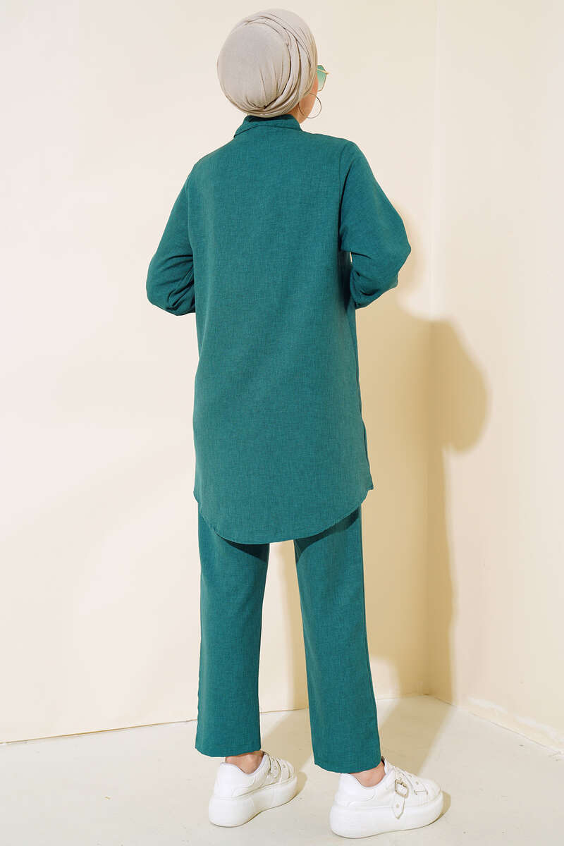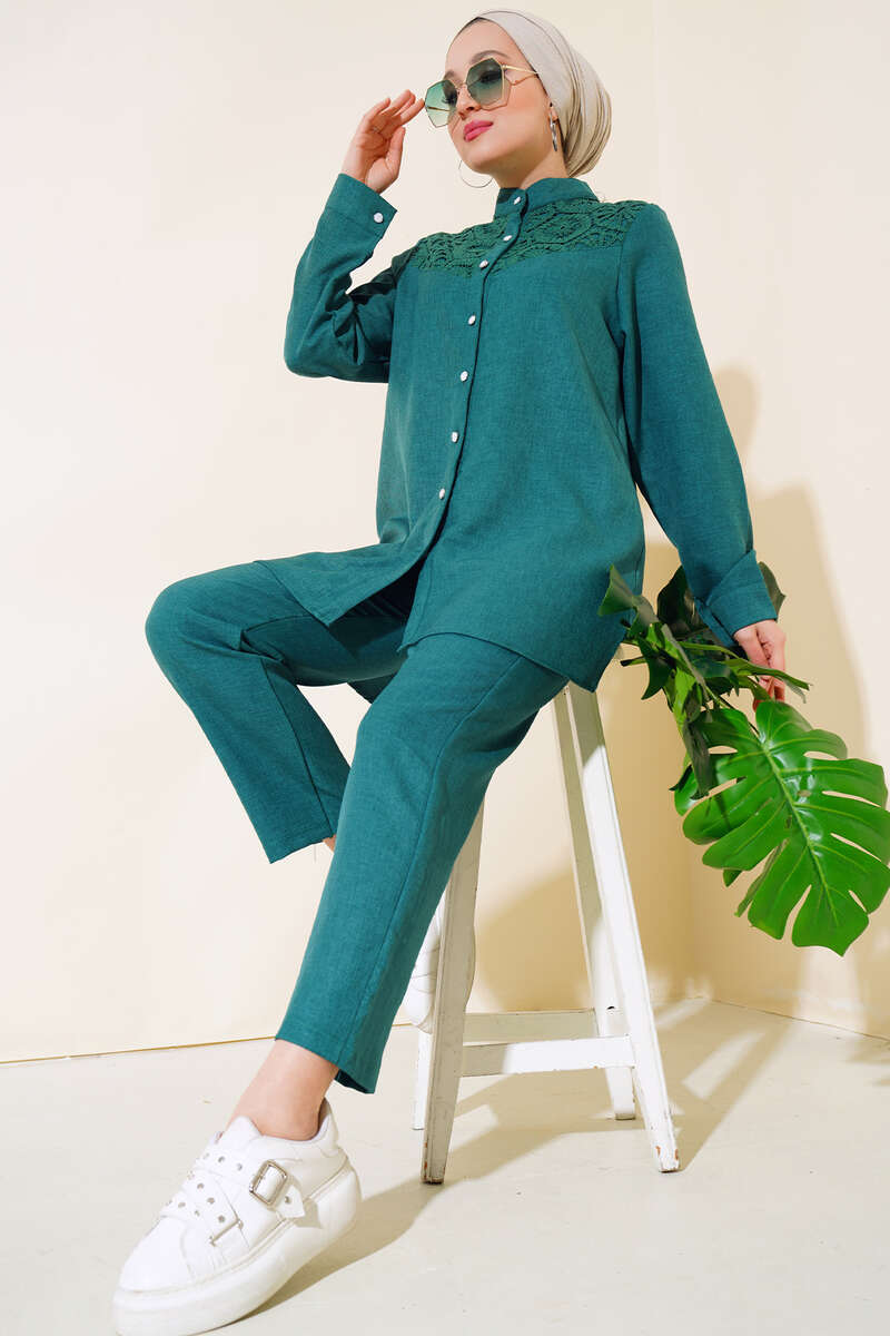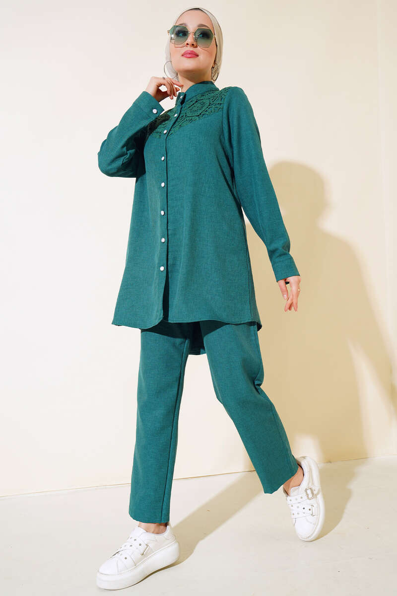 Yeni sezon ikili takım modelimiz sizlerledir. Tuniğimiz boydan düğmelidir. Yakası dantel detaylıdır. Kol bilekleri düğmelidir. Önü kısa arkası uzundur. Salaş bir yapıya sahiptir. Pantolonumuzun beli lastiklidir. Paçası dar paçadır. Yaz günlerinizde rahatlıkla kullanabilirsiniz. Takımımızın renk seçenekleri mevcuttur.