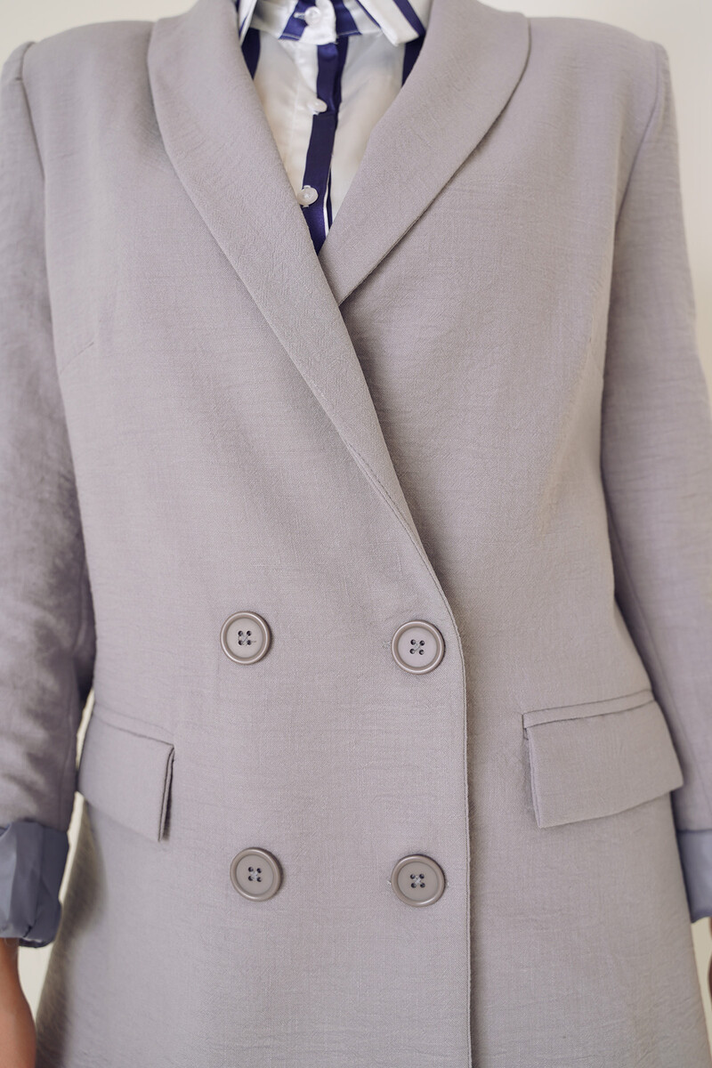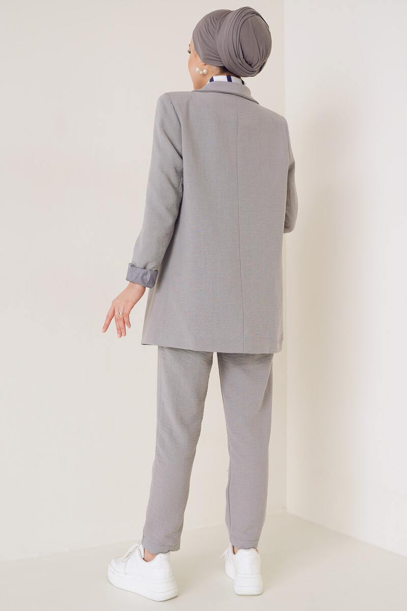 Yeni sezon keten ikili takımımız pantolon ve ceketten oluşmaktadır. İkili takımımızın ceketi mono yakadır. Hem iç hem dış düğmesi bulunan ceketimiz iki adet kapaklı süs cebe sahiptir. İçi astarlıdır. İkili takımımızn pantolonu pens detaylıdır. Beli arkadan lastikli oaln pantolonumuzun iki adet cebi vardır. Cepleri kullanılalbilmektedir.