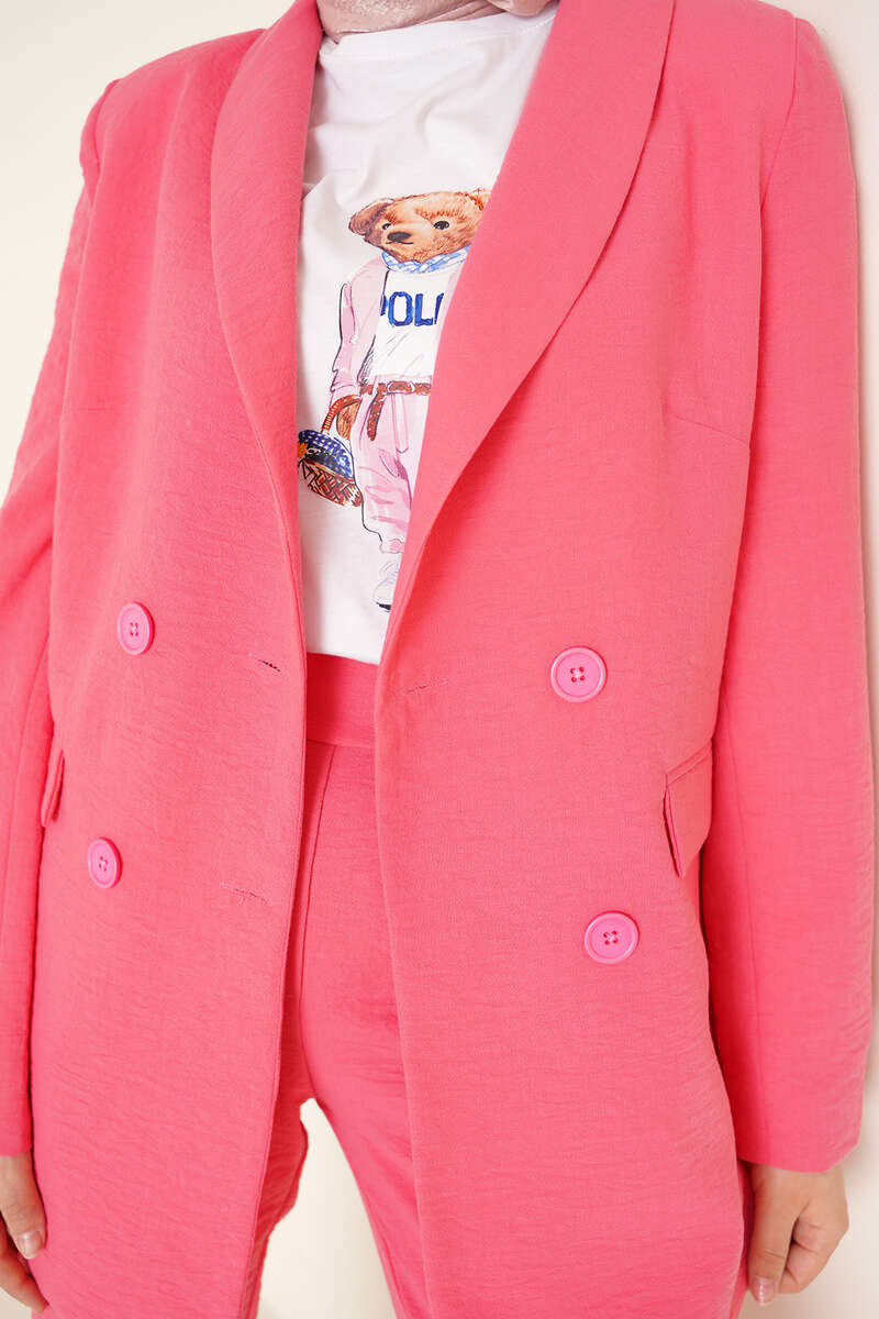Yeni sezon keten ikili takımımız pantolon ve ceketten oluşmaktadır. İkili takımımızın ceketi mono yakadır. Hem iç hem dış düğmesi bulunan ceketimiz iki adet kapaklı süs cebe sahiptir. İçi astarlıdır. İkili takımımızn pantolonu pens detaylıdır. Beli arkadan lastikli oaln pantolonumuzun iki adet cebi vardır. Cepleri kullanılalbilmektedir.