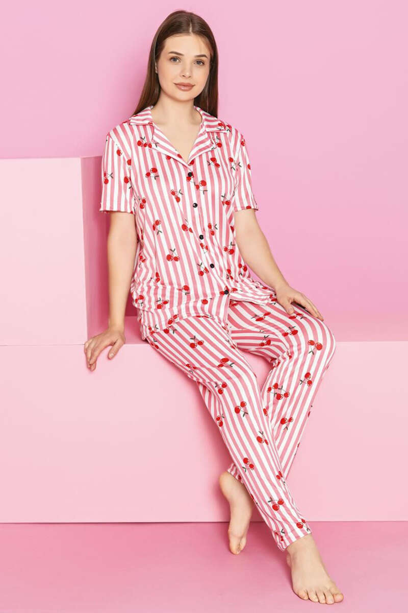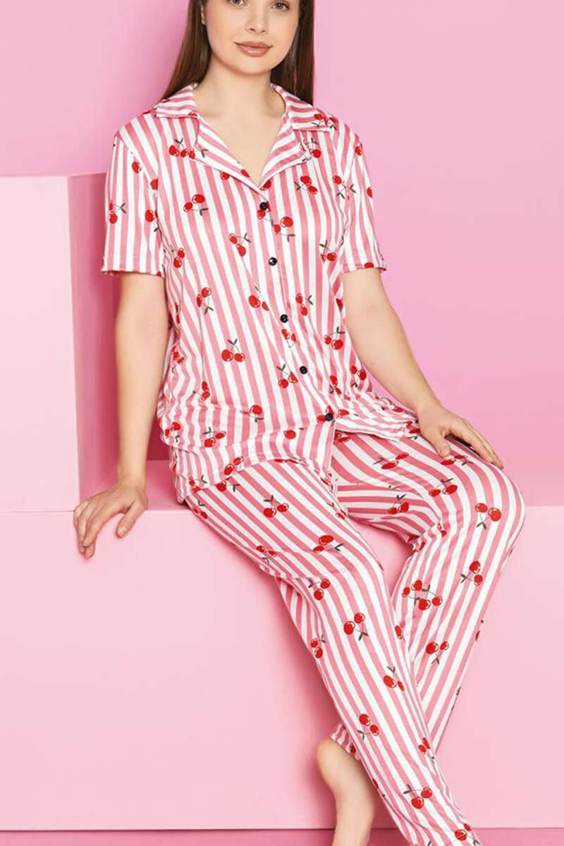 Kiraz Baskılı Çizgili Kısa Kol Pijama Takımı Pembe
