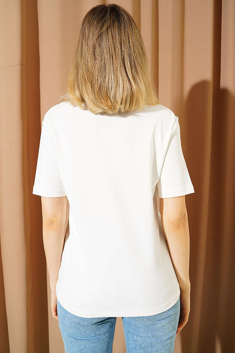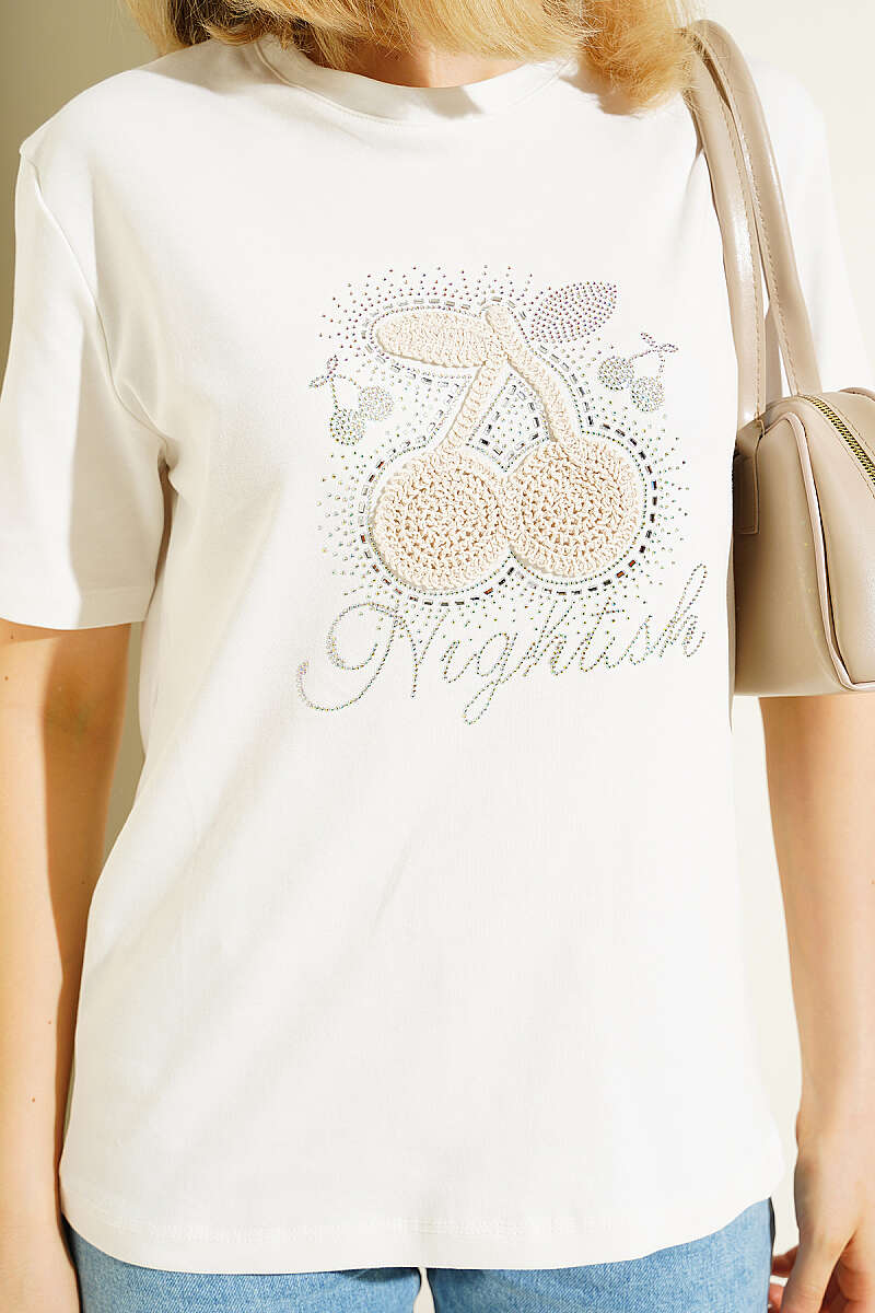 Kiraz Baskılı Mini Taşlı T-shirt Ekru