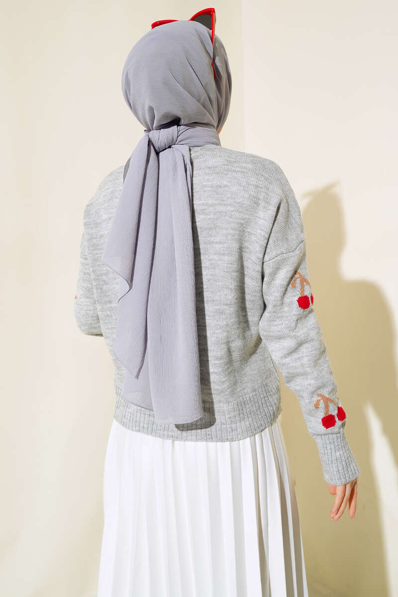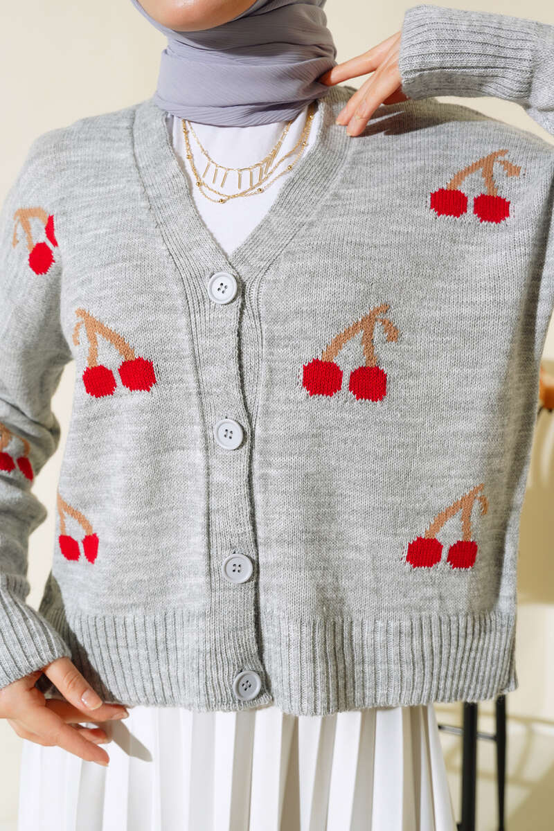 Kiraz Desen Düğmeli Kısa Hırka Gri