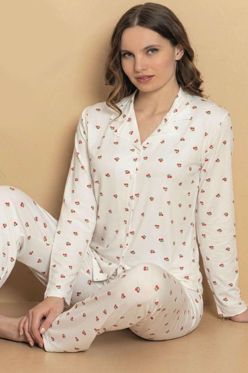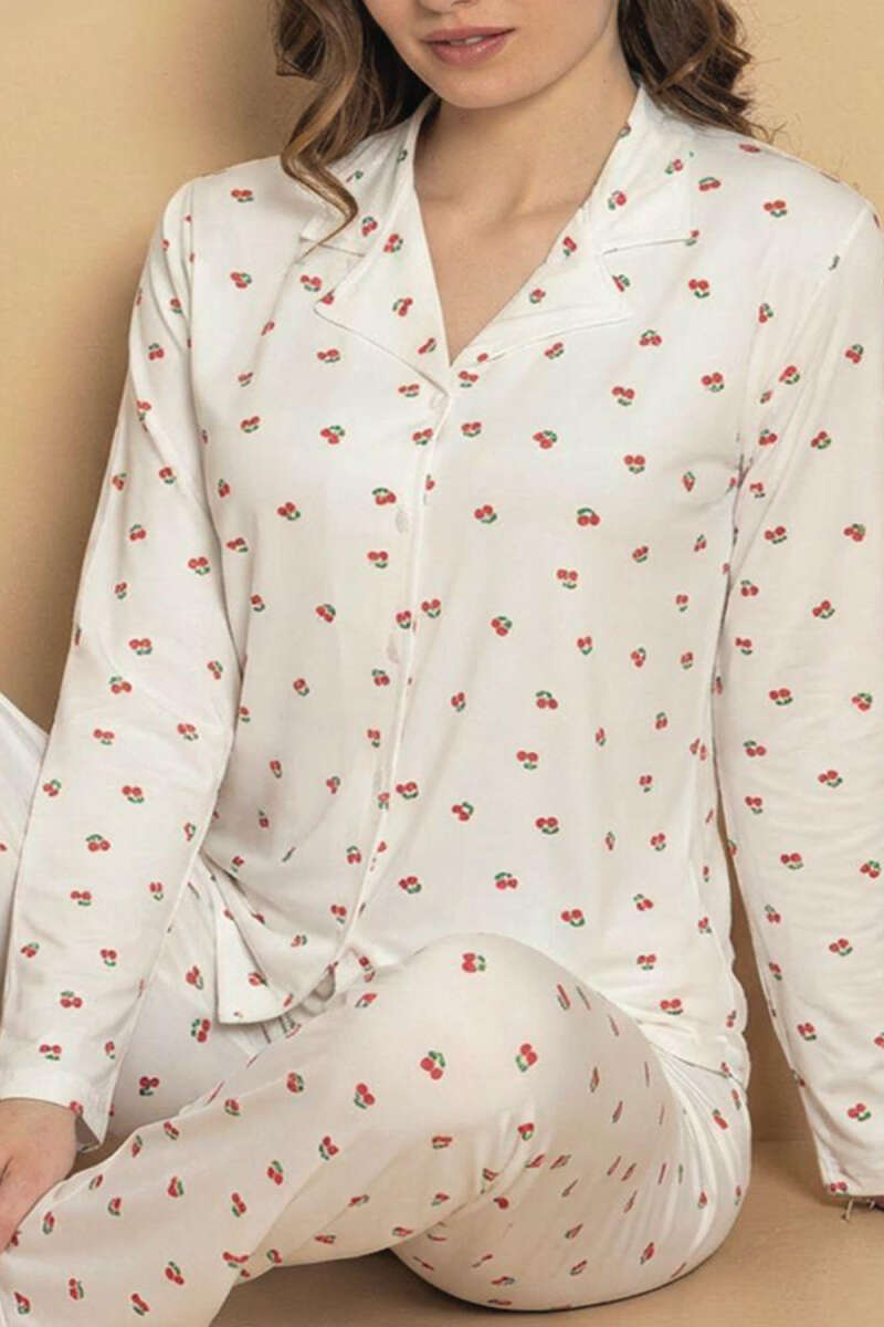 Kiraz Desenli Düğmeli Gömlek Yaka Pijama Takımı Beyaz