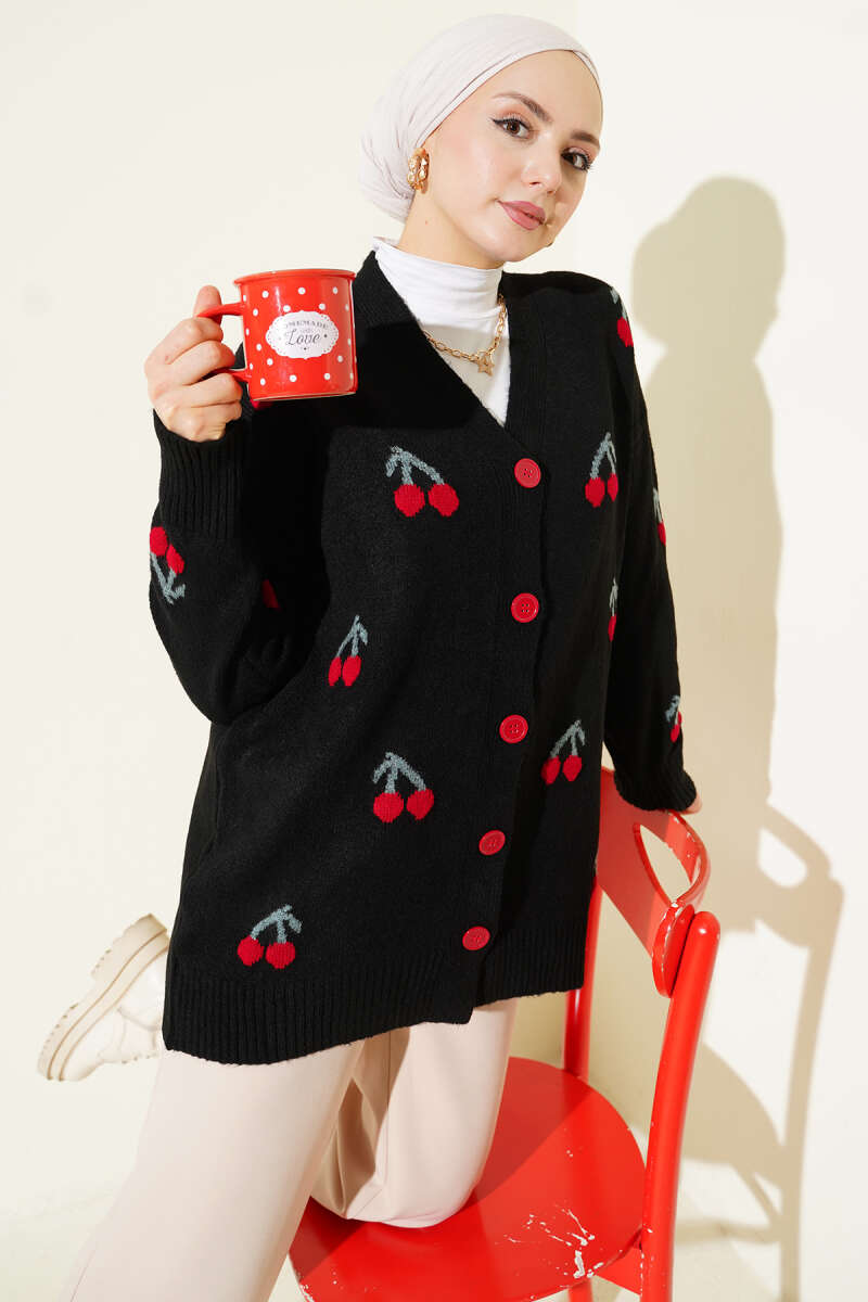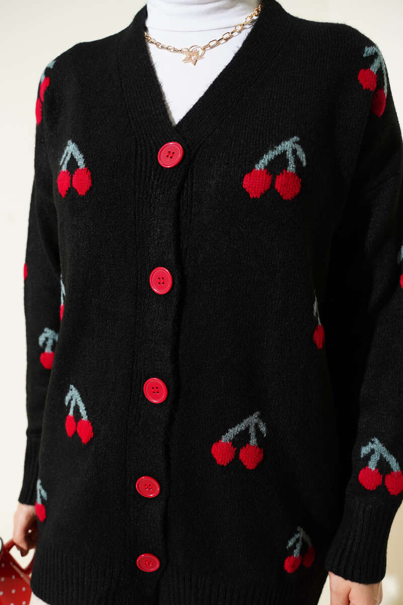 Kiraz Desenli Düğmeli Triko Hırka Siyah