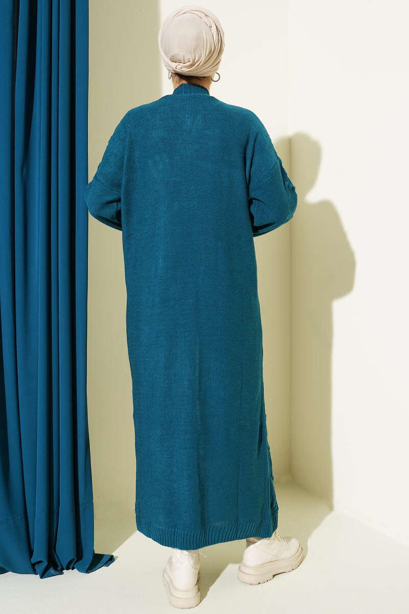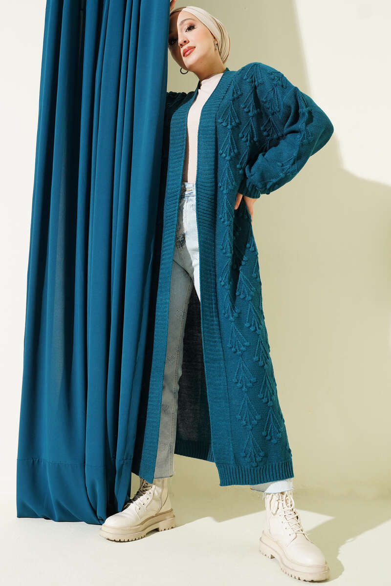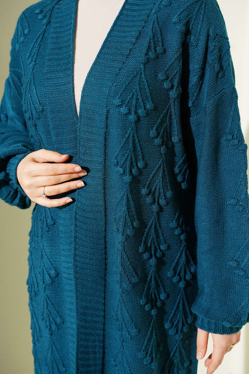 Kiraz Kabartmalı Uzun Triko Hırka Petrol