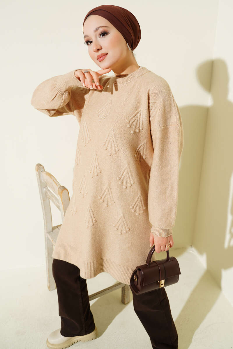 Kiraz Salkımlı Kabartma Yumoş Triko Tunik Latte