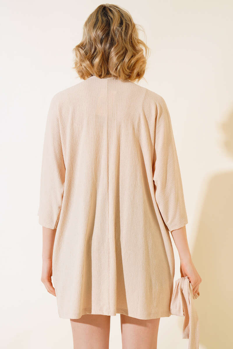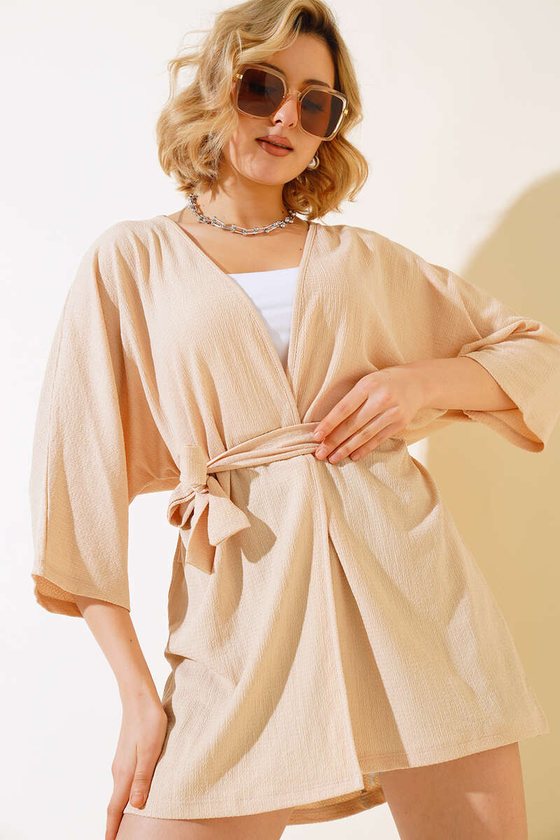Yeni sezon kimono modelimiz sizlerle beraber. Kimonomuz kırınkıl kumaştır. Kimonomuzun iki adet kemer köprüsü olup, kendi kumaşından kuşağı mevcuttur. Sade ve şık kimonomuz kombinlerinizin favori parçası olacaktır.