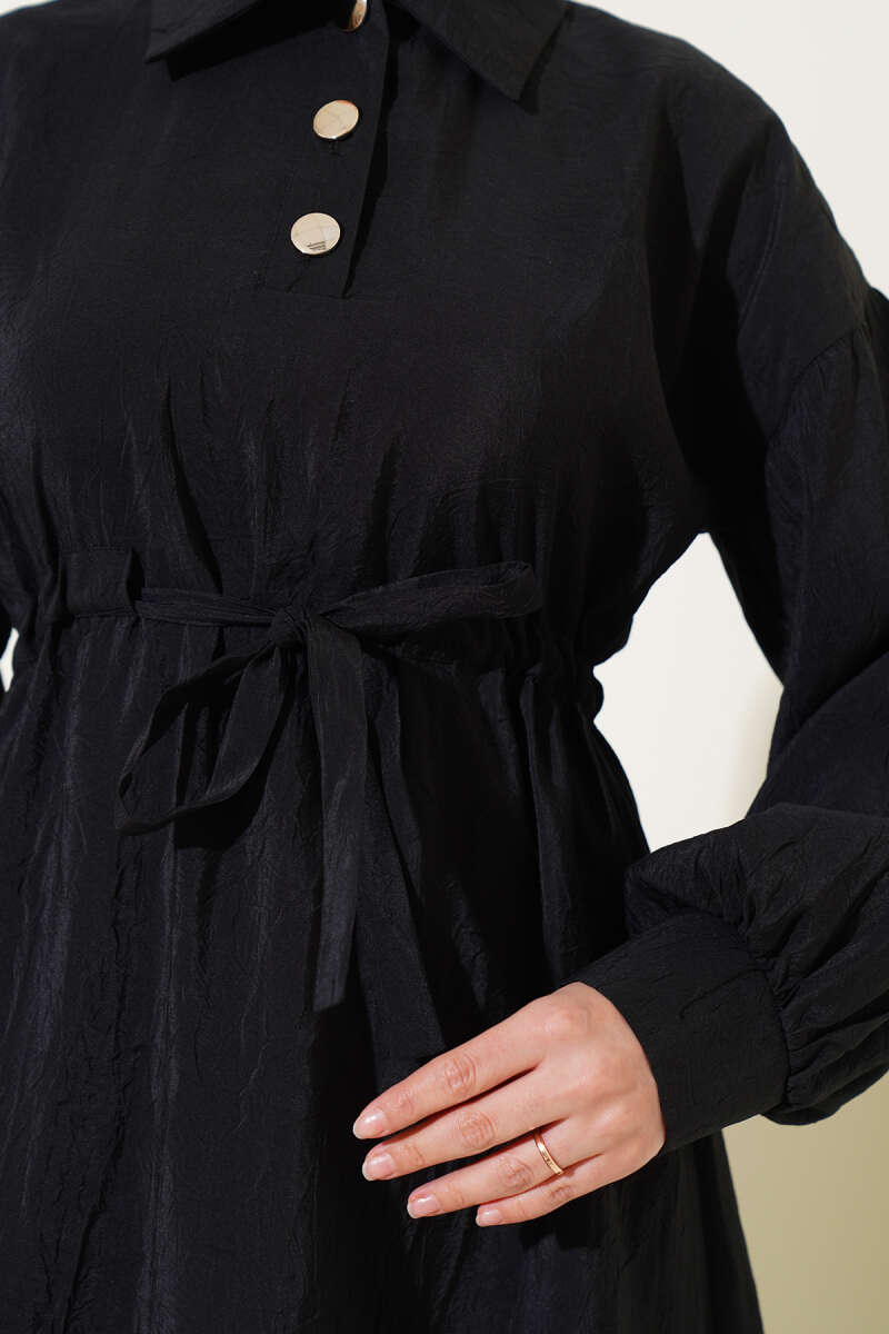 Kırışık Doku Yarım Düğmeli Elbise Siyah