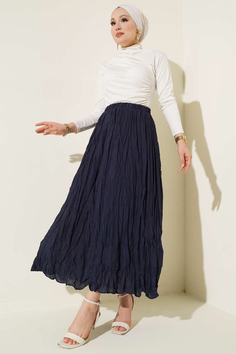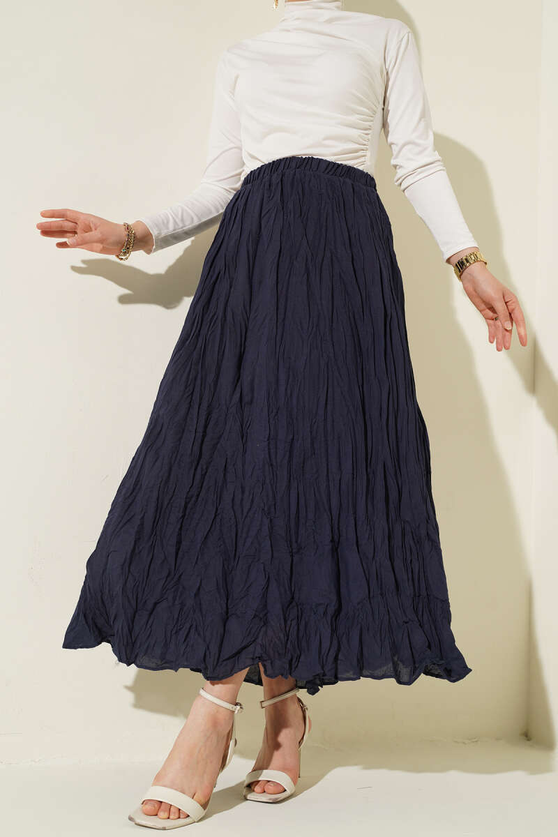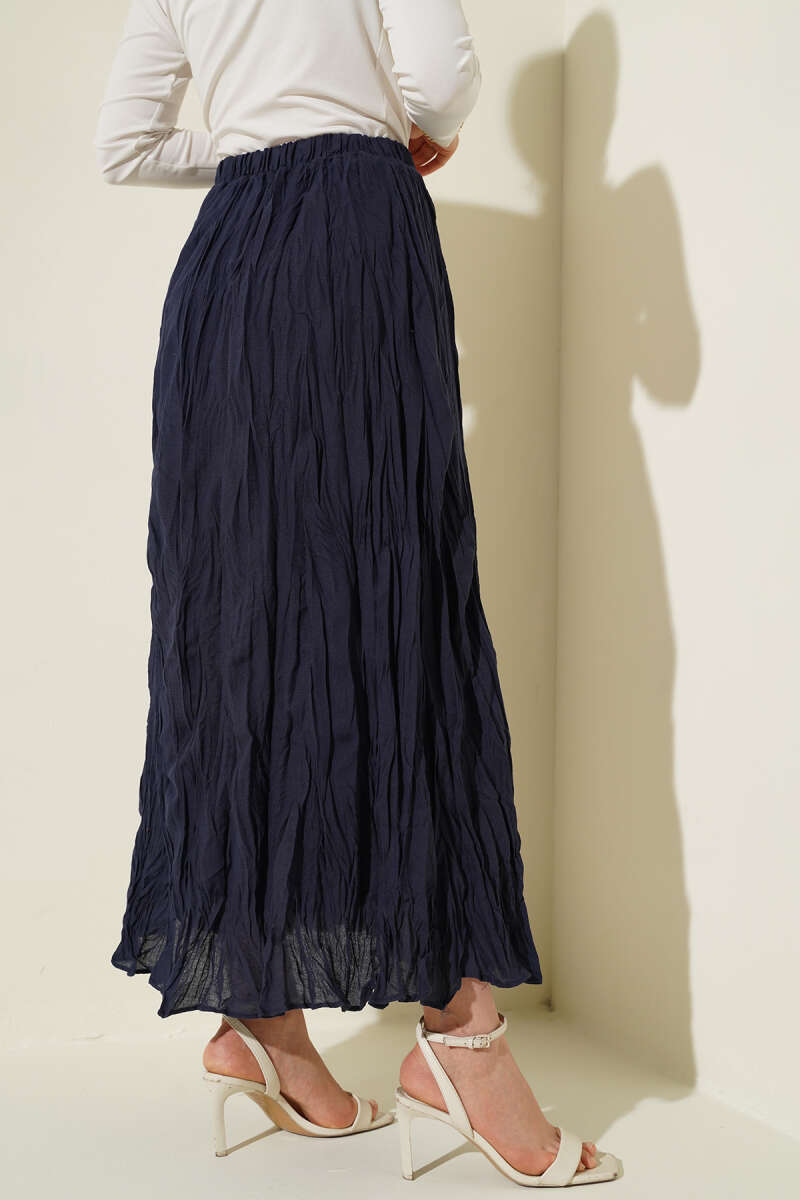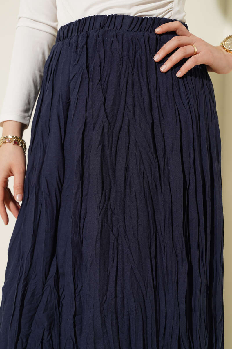 Beli Kemerli Lastikli Pileli Etek Lacivert