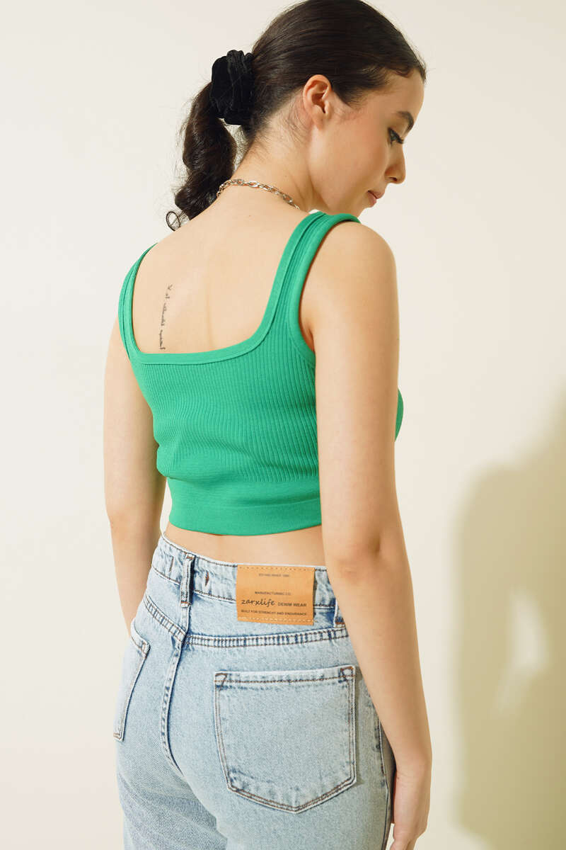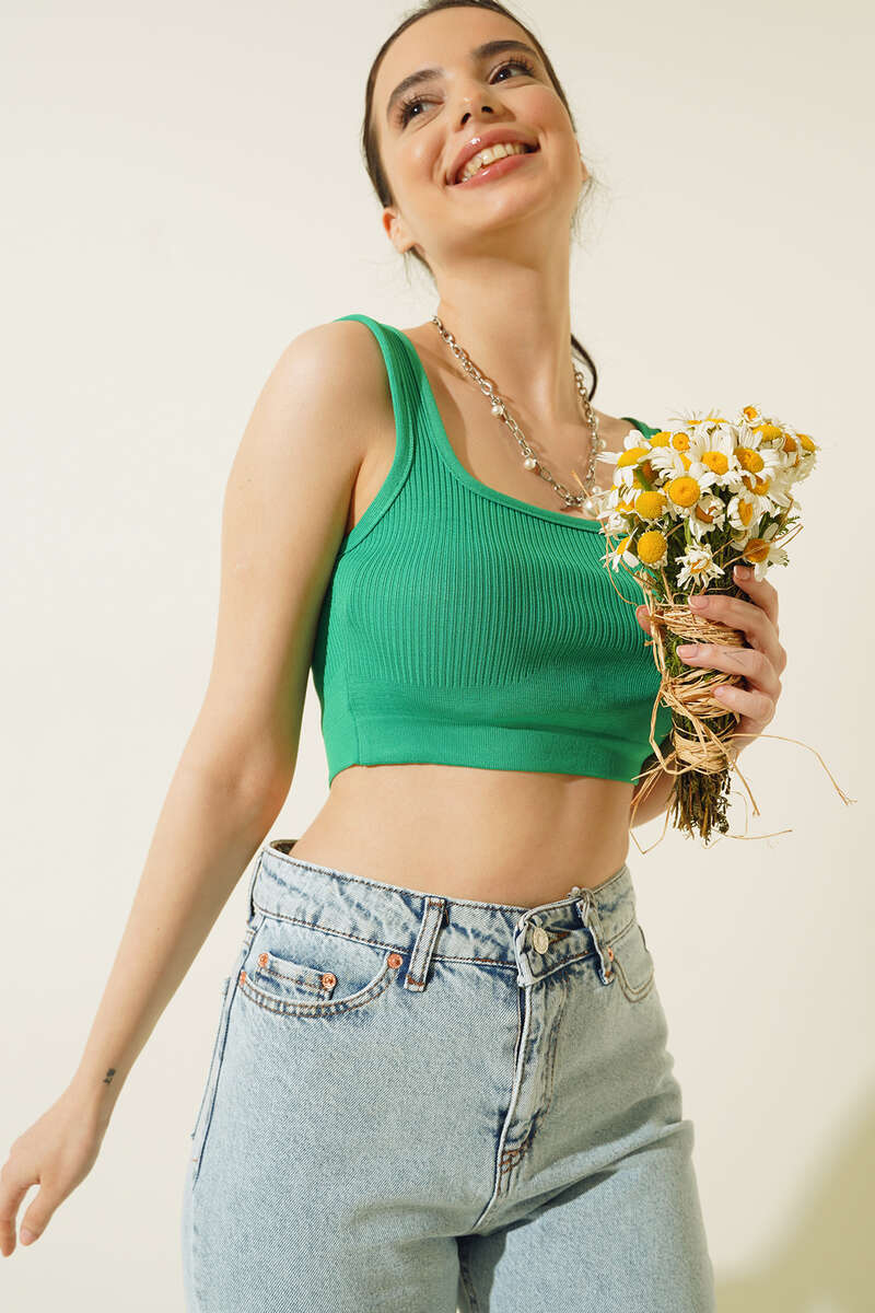 Yeni sezonun favorisi kısa fitilli crop modelimiz iddialı tarzıyla dikkat çekiyor. Crop modelimizin kol uçları lastiklidir. Aynı şekilde göğsü de lastikli olan crop bu yaz favorileriniz arasında olacak.