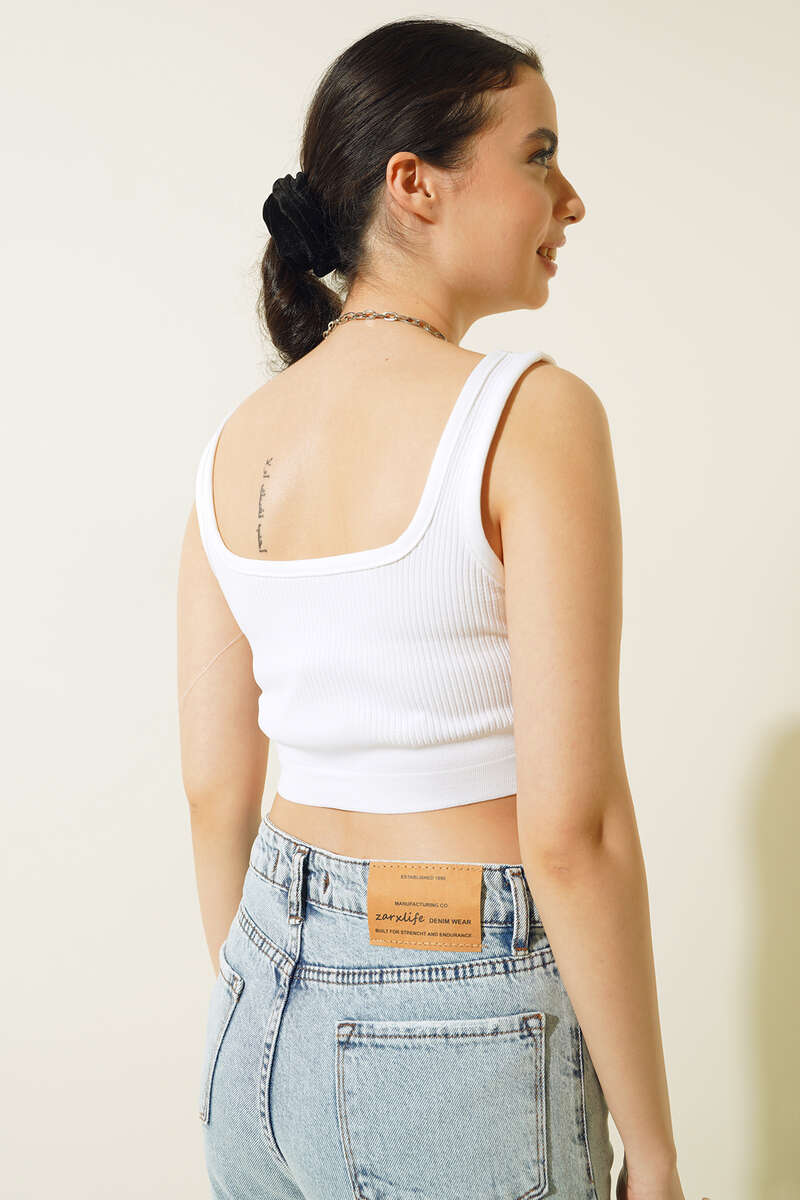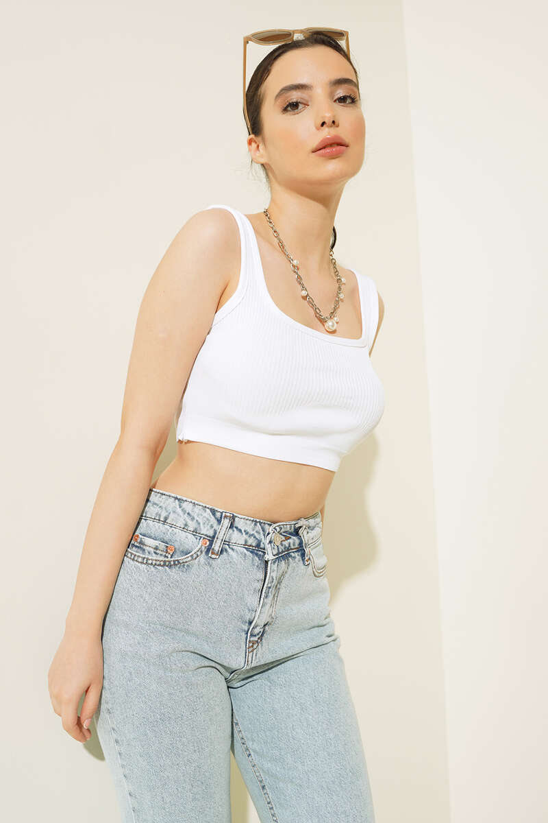 Yeni sezonun favorisi kısa fitilli crop modelimiz iddialı tarzıyla dikkat çekiyor. Crop modelimizin kol uçları lastiklidir. Aynı şekilde göğsü de lastikli olan crop bu yaz favorileriniz arasında olacak.