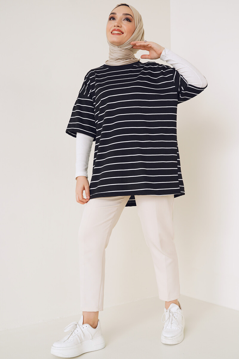 Yeni sezon tshirt modelimiz rahat tasarımıyla sizler için geldi. Tshirt modelimiz ince şerit desenlidir. Bisiklet yakası vardır. Oldukça rahattır. Yaz kombinlerinizin vazgeçilmez parçalarından biri olacaktır.