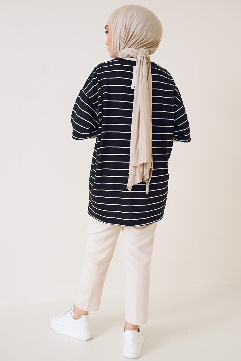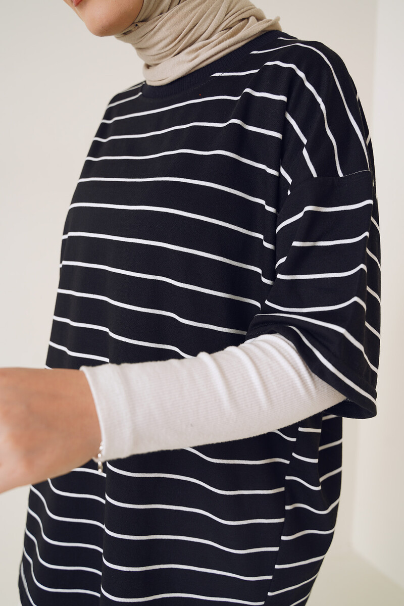 Kısa Kol Basic Çizgili Tshirt Siyah