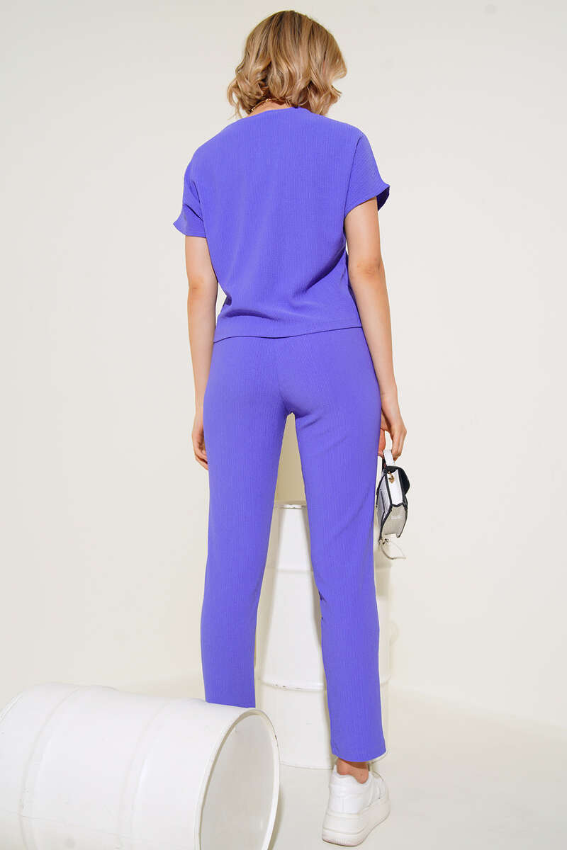 Yeni sezon ikili takımımız t-shirt ve pantolondan oluşmaktadır. T-shirt oval yaka, salaş modeldir. Kısa kolludur. Pantolonumuz bel lastiklidir. Belinde ip süslemesi bulunmaktadır. Cepleri kullanılabilir. İkili takımımızın şıklığına ve rahatlığına hayran kalacaksınız.