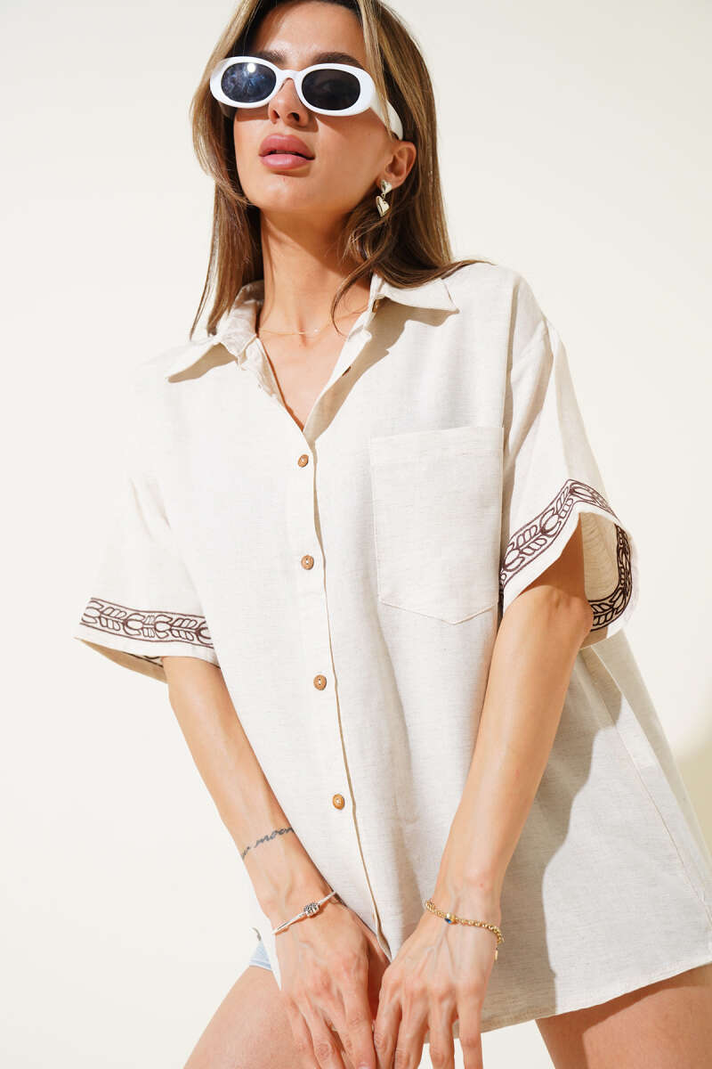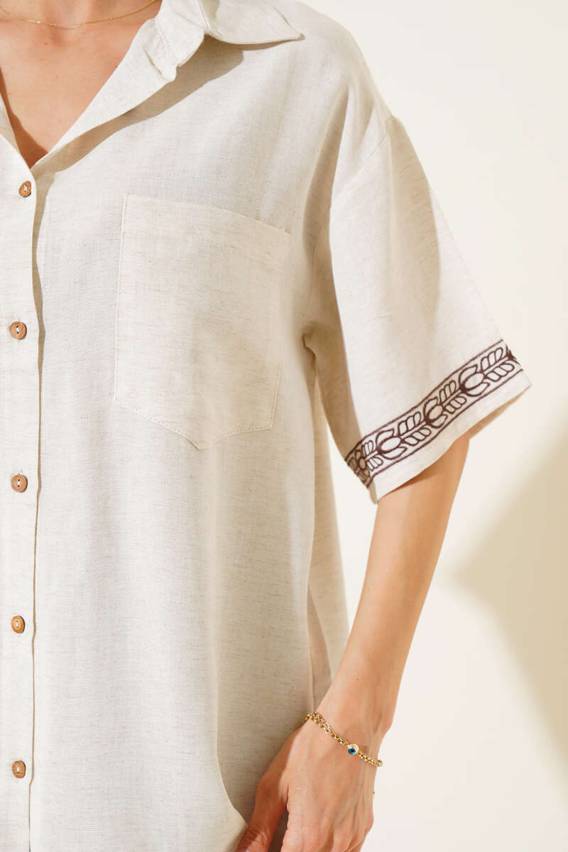 Kısa Kol Nakışlı Cepli Gömlek Taş