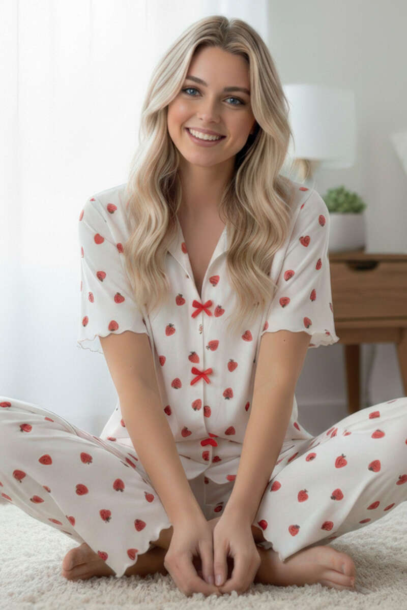 Kısa Kol Önü Kurdeleli Desenli Pijama Takımı Çilek