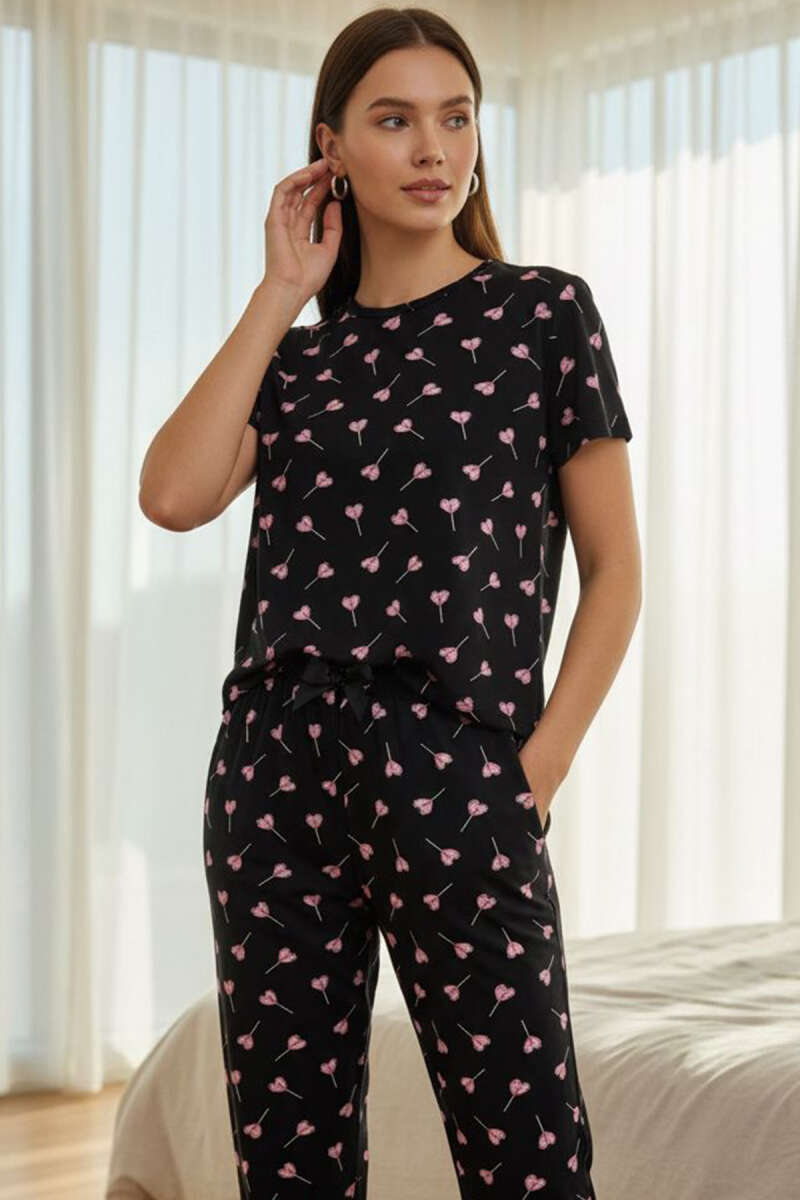 Kısa Kollu Bisiklet Yaka Desenli Pijama Takımı Asorti 2