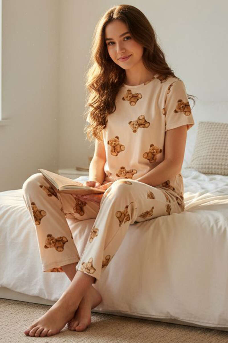 Kısa Kollu Bisiklet Yaka Desenli Pijama Takımı Asorti 3