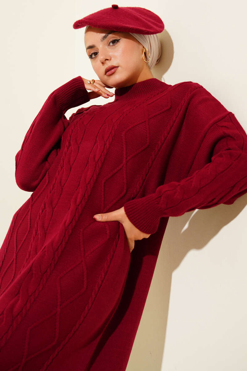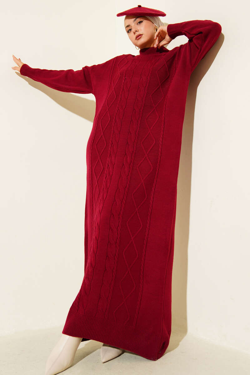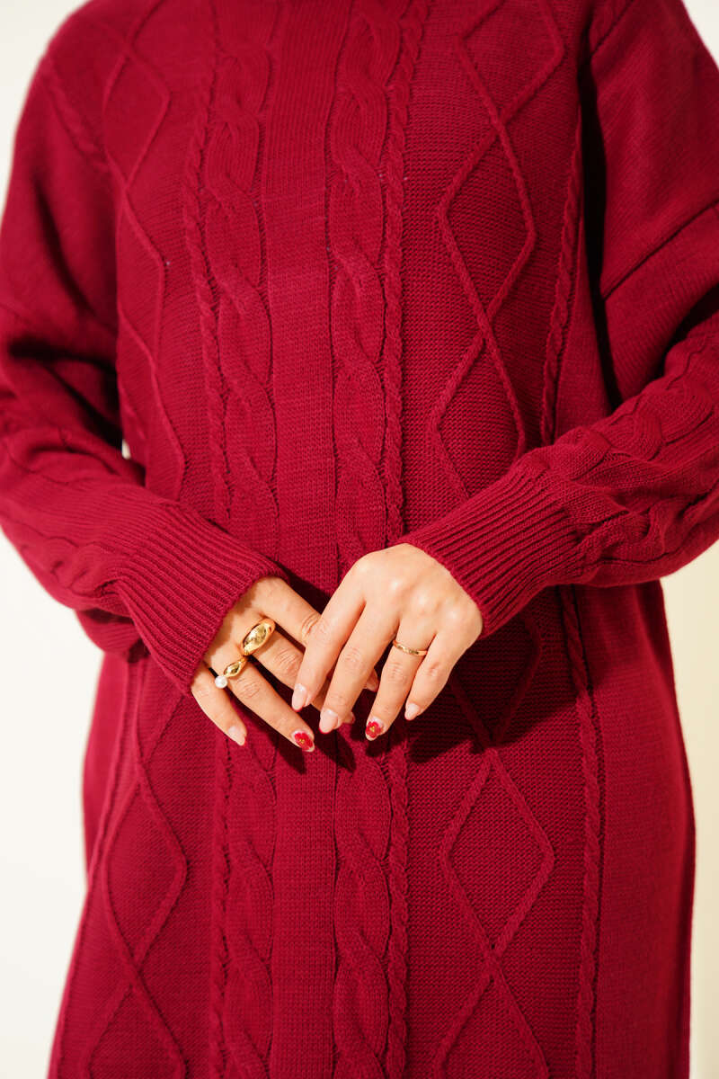 Kıvrım Örgülü Triko Elbise Bordo