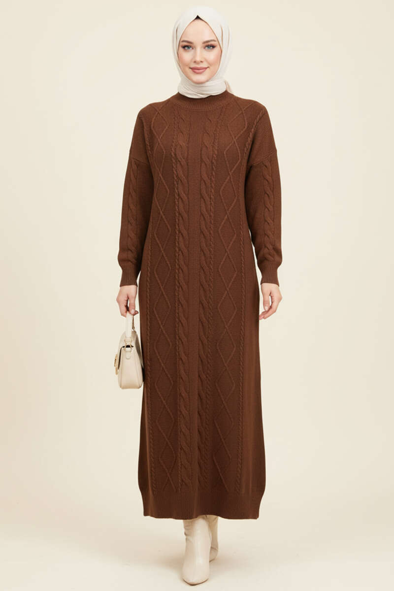 Bisiklet Yaka Triko Basic Elbise Kahve