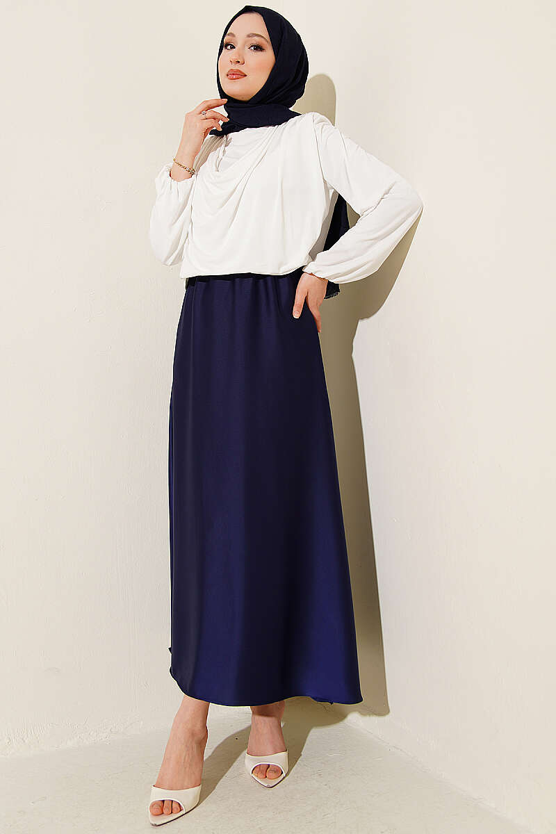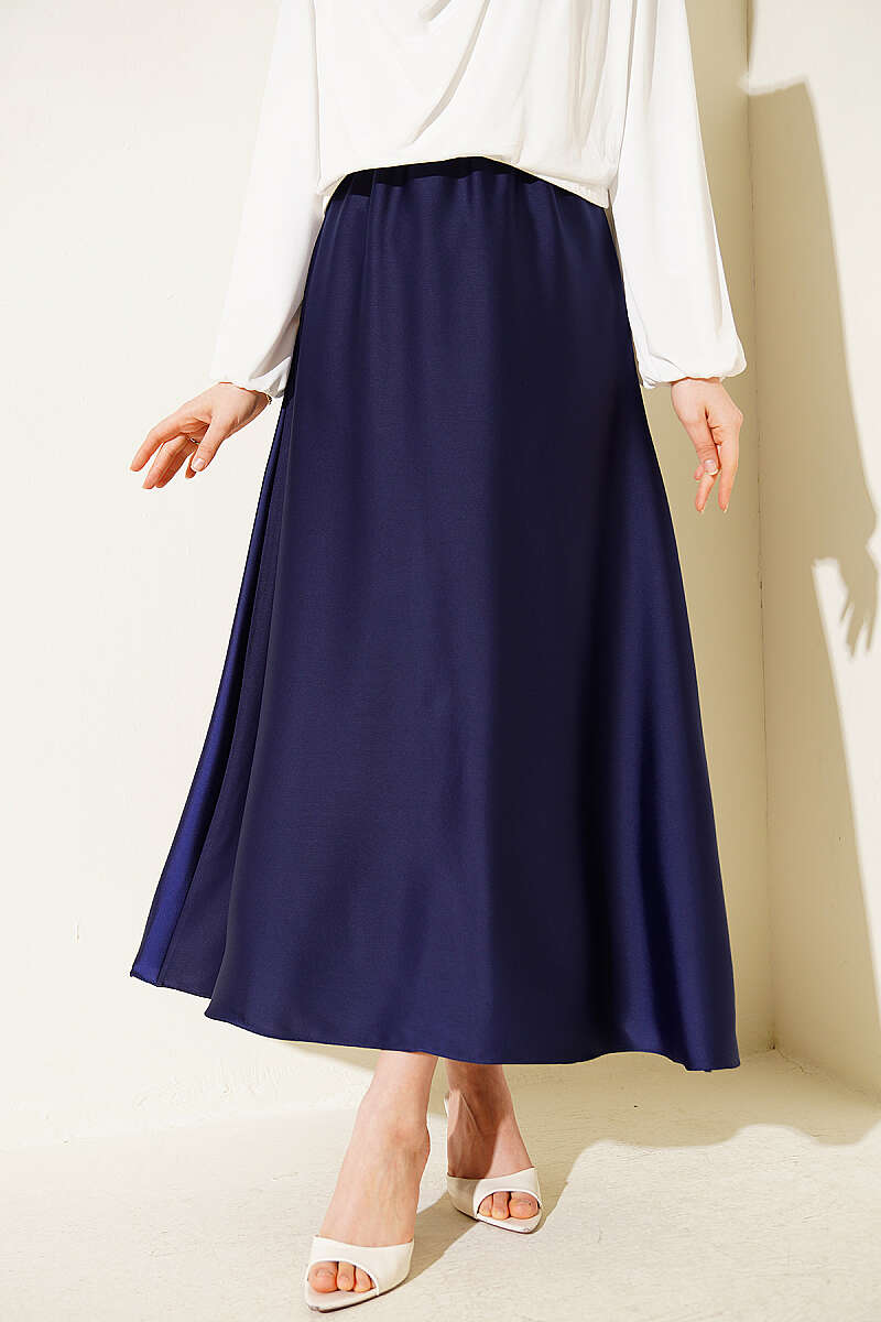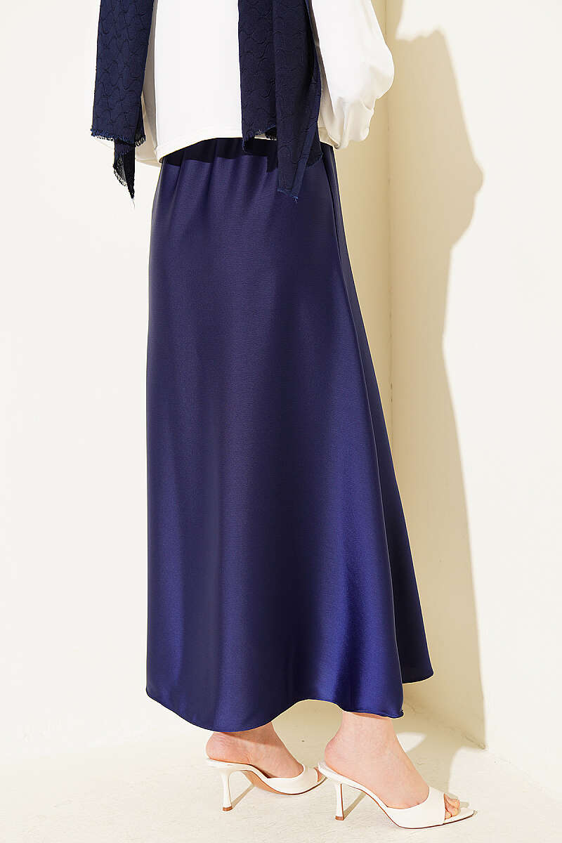 Beli lastikli yapısı sayesinde konforlu bir kullanım sağlarken, aşağıya doğru genişleyen dökümlü formu hareketlerinize zarif bir eşlikçi olur. Şık bir davetten günlük şehir stiline kadar geniş bir yelpazede kullanılabilen bu parça, satenin pürüzsüz dokunuşuyla gardırobunuza sofistike bir hava katar.