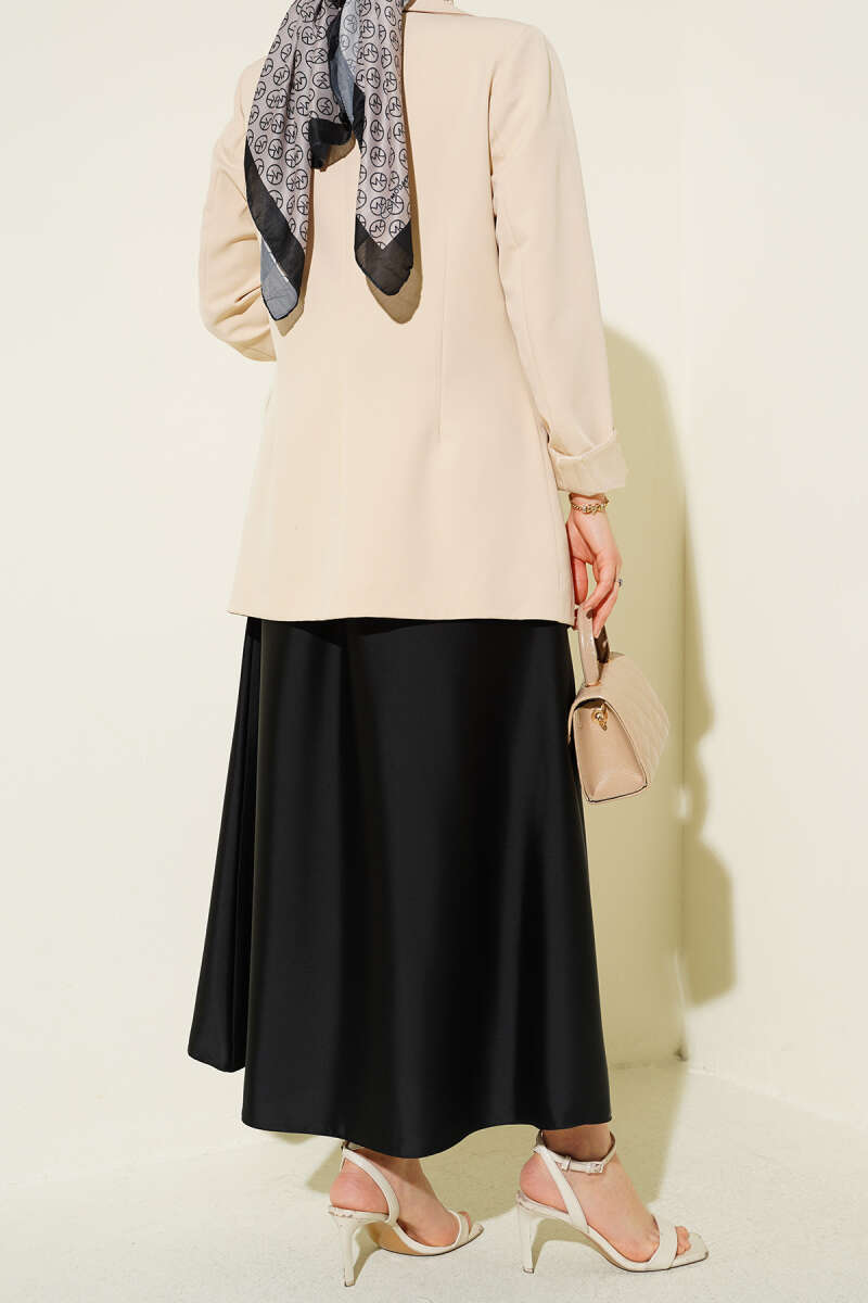 Beli lastikli yapısı sayesinde konforlu bir kullanım sağlarken, aşağıya doğru genişleyen dökümlü formu hareketlerinize zarif bir eşlikçi olur. Şık bir davetten günlük şehir stiline kadar geniş bir yelpazede kullanılabilen bu parça, satenin pürüzsüz dokunuşuyla gardırobunuza sofistike bir hava katar.